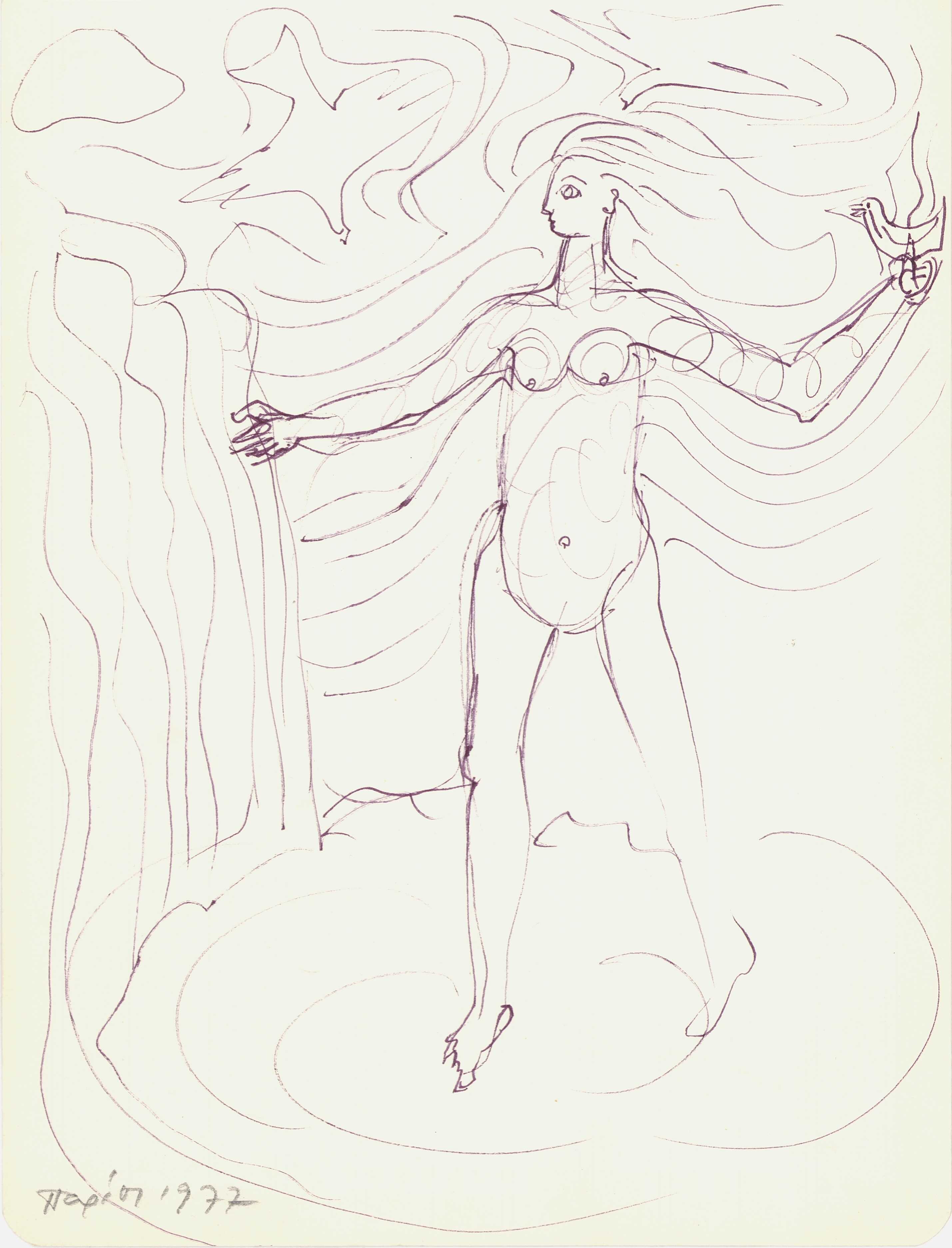 en A drawing by Alex Mylona depicting a woman and a dove. The composition is dominated by curved lines surrounding the female figure.