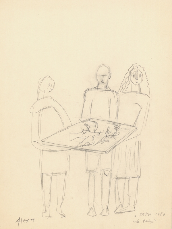 el Λιτό γραμμικό σχέδιο, το οποίο ορίζεται από την παρουσία τριών μορφών. Οι ενήλικες μορφές, οι οποίες φέρονται να έχουν δευτερεύοντα ρόλο στη συνολική σύνθεση, η οποία φέρει στοιχεία συμβολικού περιεχομένου, κρατούν στα χέρια τους μια πλάκα με ένα νεκρό περιστέρι. Η καλλιτέχνιδα μέσω του έργου της επιχειρεί να μεταδώσει ένα βαθυστόχαστο μήνυμα: πως οι άνθρωποι με τις πράξεις τους "κρατούν" στα χέρια τους την ειρήνη.