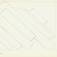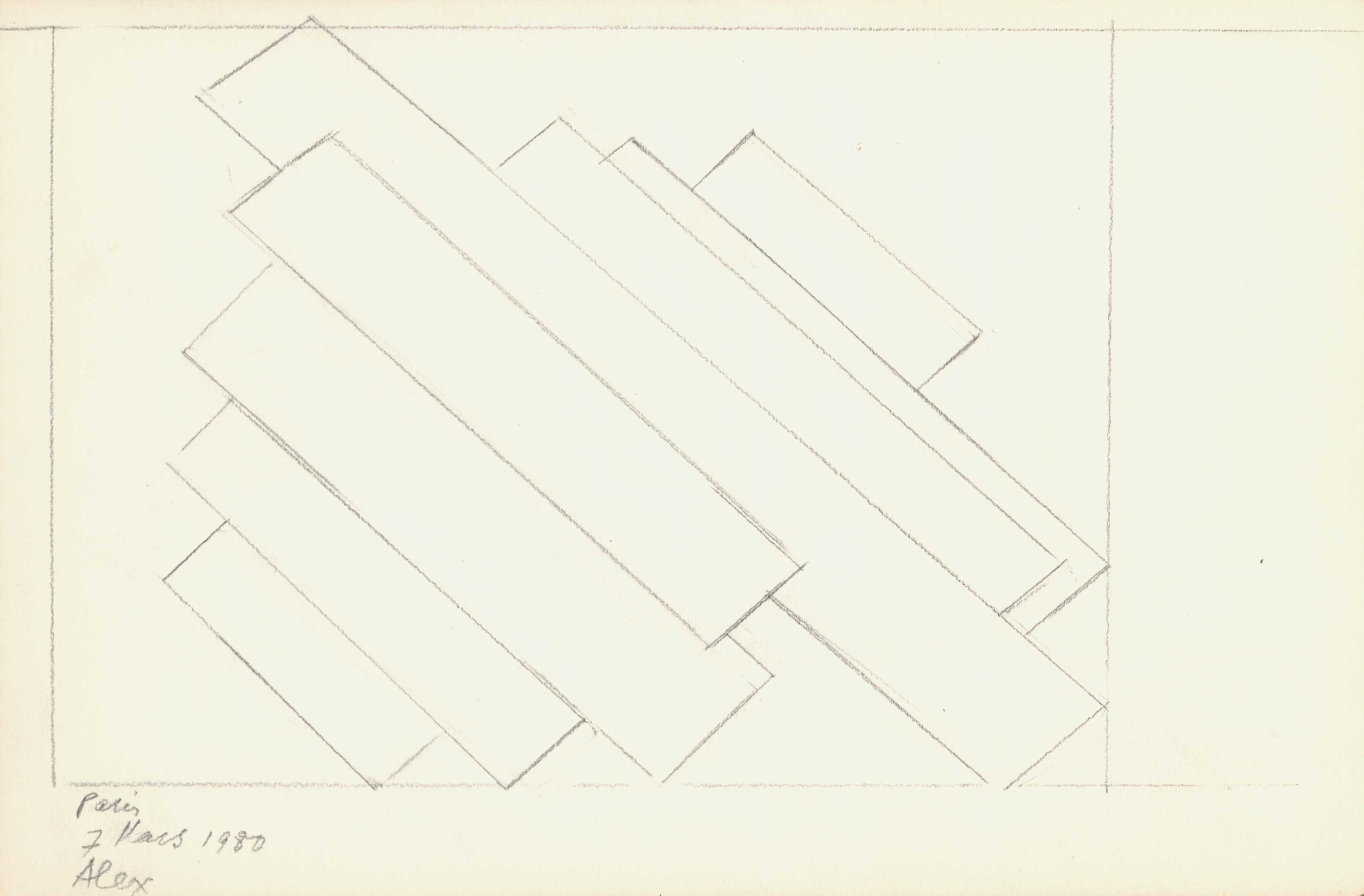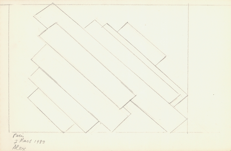 el Λεύκωμα canson της Άλεξ Μυλωνά, στο οποίο δημιουργεί μια σειρά σχεδίων. Εδώ μια γεωμετρική σύνθεση ορθογώνιων παραλληλόγραμμων σχημάτων, η οποία αναπτύσσεται σε διαγώνια αριστερή ανάπτυξη.