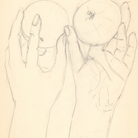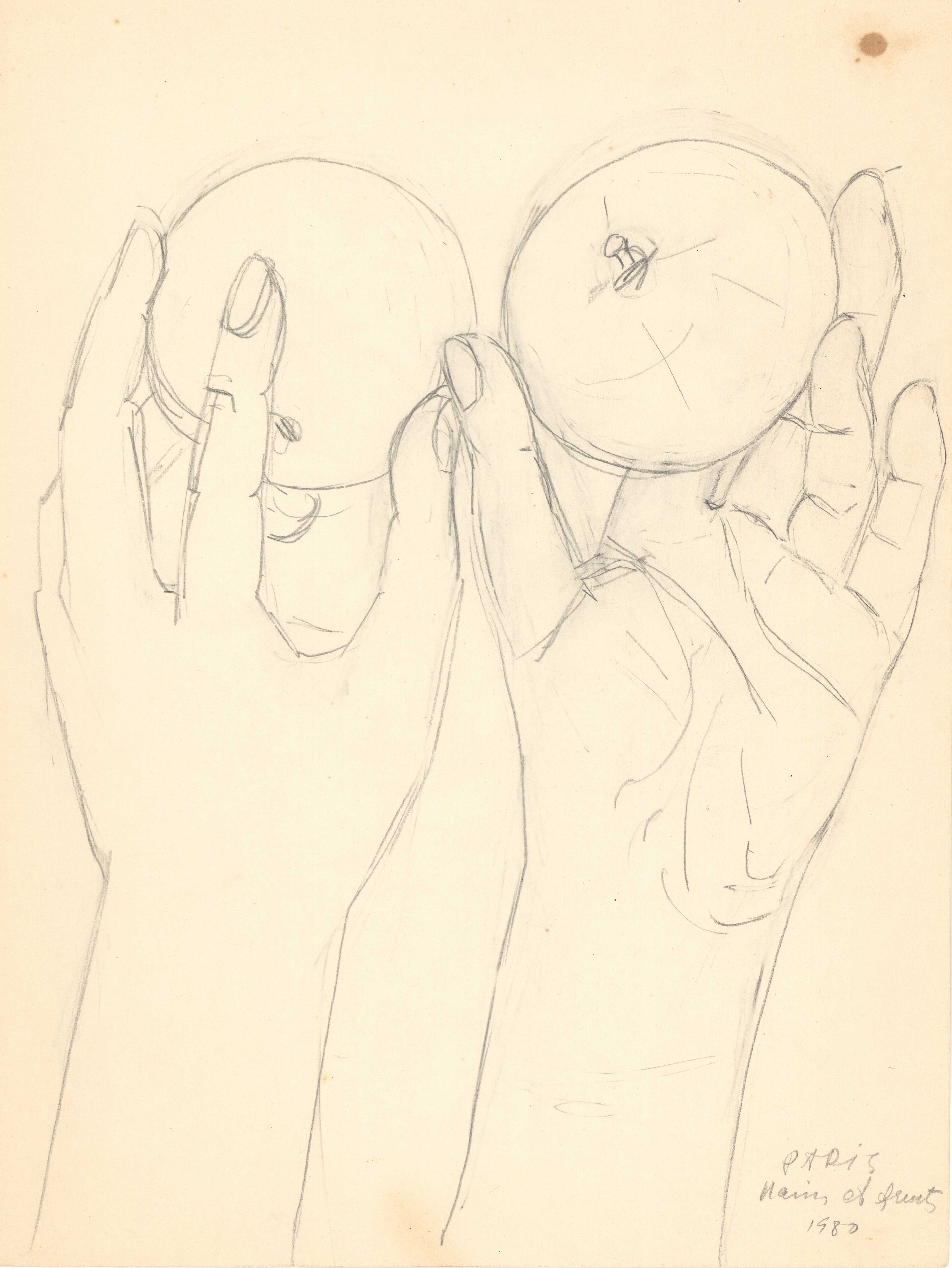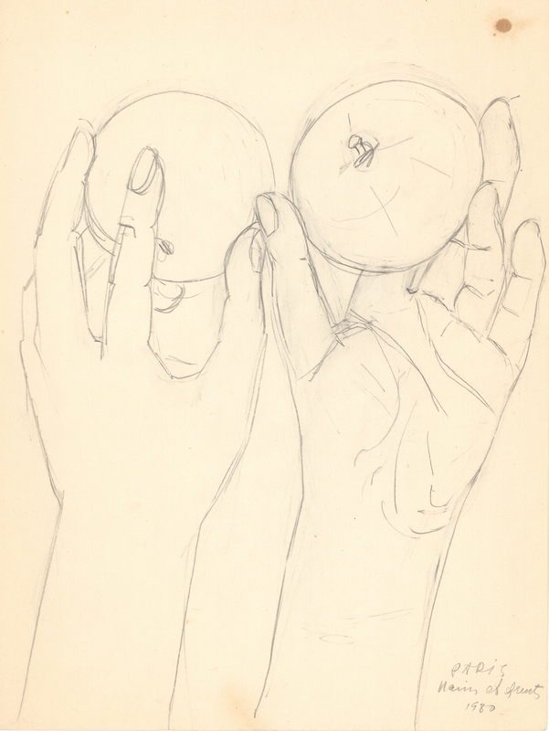 en Study for the depiction of hands with fruit. The artist is conducting a series of studies of hands in various motif variations, seeking to study and render the movement and expressiveness of hands, one of the most difficult elements of painting.