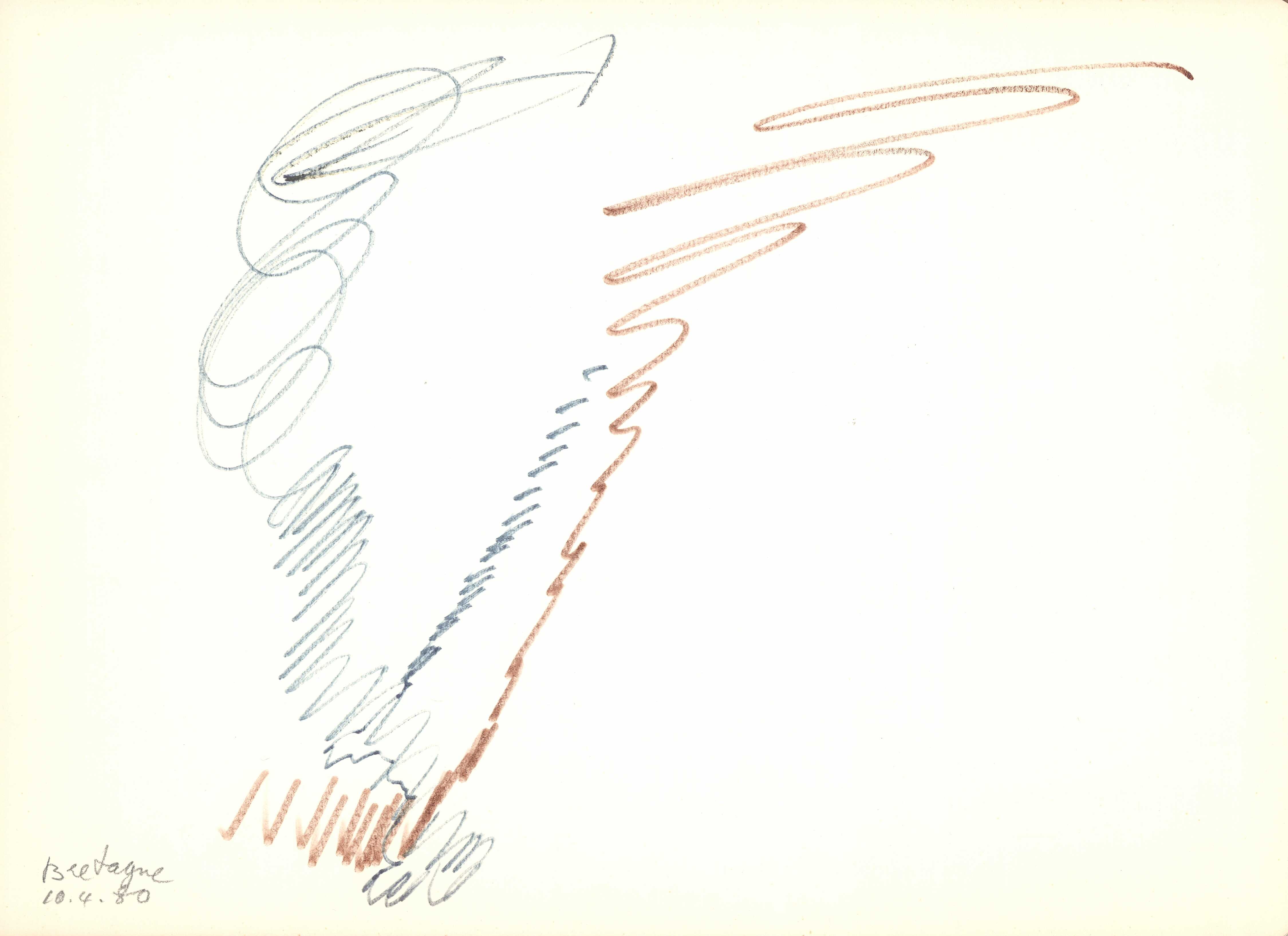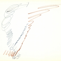 en Abstract composition with blue and brown markers.