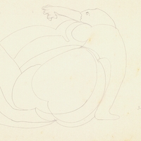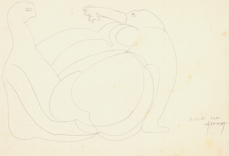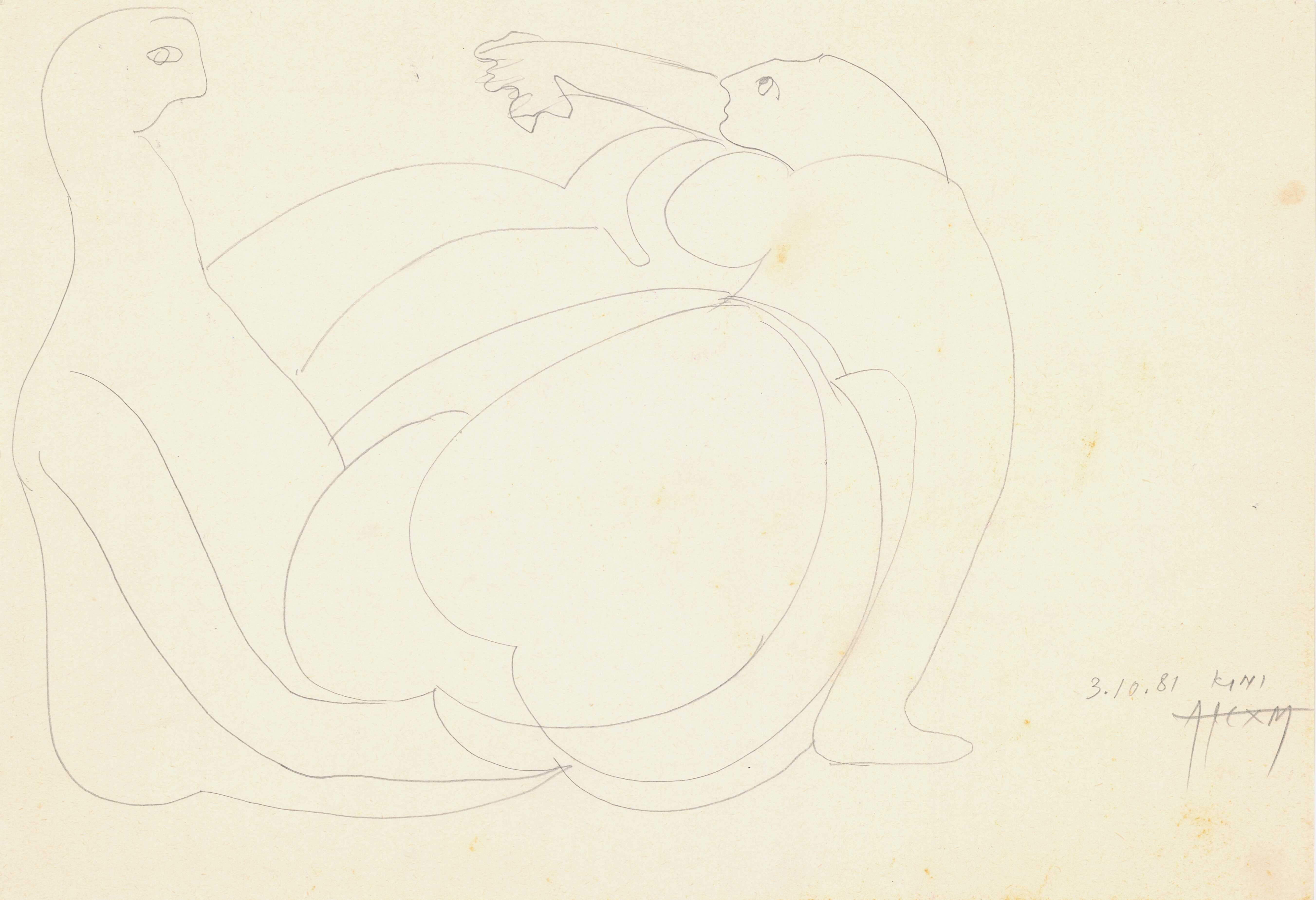 en Humorous composition with two oversized figures touching each other. Strong curved lines dominate.