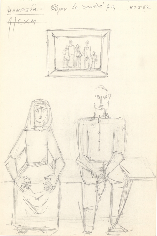 The early period of her work mainly consisted of representational sculptures focusing on the human form. Her move to Paris in the 1960s and her encounters with significant artists such as H. Arp, A. Giacometti, and O. Zadkine were transformative and shaped her artistic oeuvre. From her early anthropocentric compositions in the 1950s, she progressed to create abstract sculptures in wrought iron characterized by frontality, strict immobility, speed, sharp endings, and a play of lines that included void form and vertical surfaces. Through the rotations, folds, curves, movements, and tensions of pliable metal elements in architectural proposals, she arrived at the deeply worked simplicity of sculptural form and the purity of geometric marble surfaces, combining circles, semicircles, squares, and rectangles. In addition to her sculptural work, Mylona created a plethora of works on paper, engaged in painting, and drew the sets and costumes for the Greek Dance Theater of Rallou Manou.