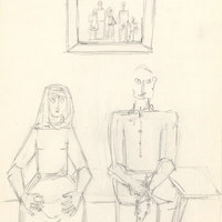 en Composition with two human figures, one male and one female, seated in front of a framed photograph depicting the entire family. The positioning of the figures sitting opposite each other without any connection between them exudes a sense of loneliness, which the artist herself notes as the title of her work.