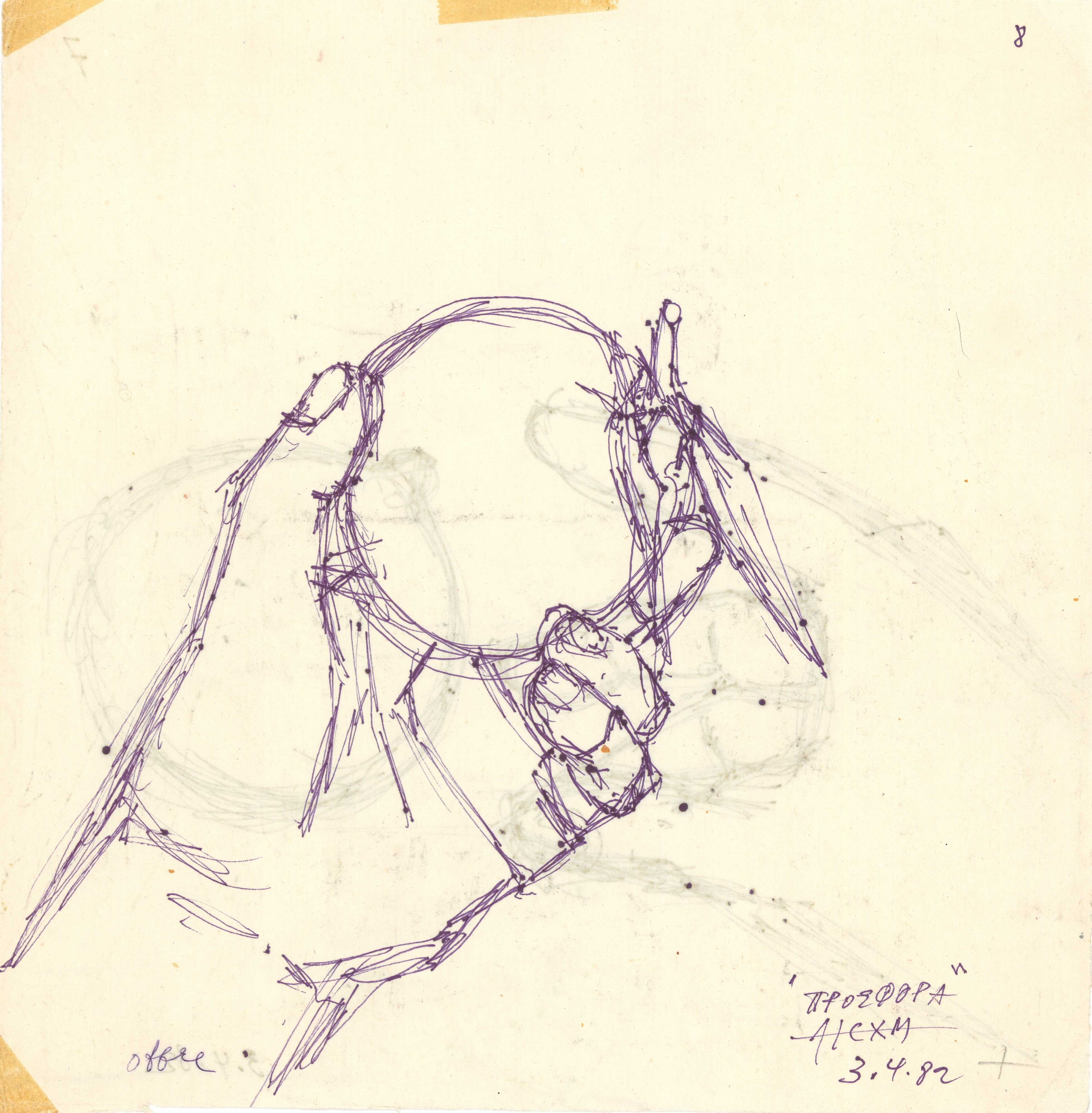 The early period of her work mainly consisted of representational sculptures focusing on the human form. Her move to Paris in the 1960s and her encounters with significant artists such as H. Arp, A. Giacometti, and O. Zadkine were transformative and shaped her artistic oeuvre. From her early anthropocentric compositions in the 1950s, she progressed to create abstract sculptures in wrought iron characterized by frontality, strict immobility, speed, sharp endings, and a play of lines that included void form and vertical surfaces. Through the rotations, folds, curves, movements, and tensions of pliable metal elements in architectural proposals, she arrived at the deeply worked simplicity of sculptural form and the purity of geometric marble surfaces, combining circles, semicircles, squares, and rectangles. In addition to her sculptural work, Mylona created a plethora of works on paper, engaged in painting, and drew the sets and costumes for the Greek Dance Theater of Rallou Manou.