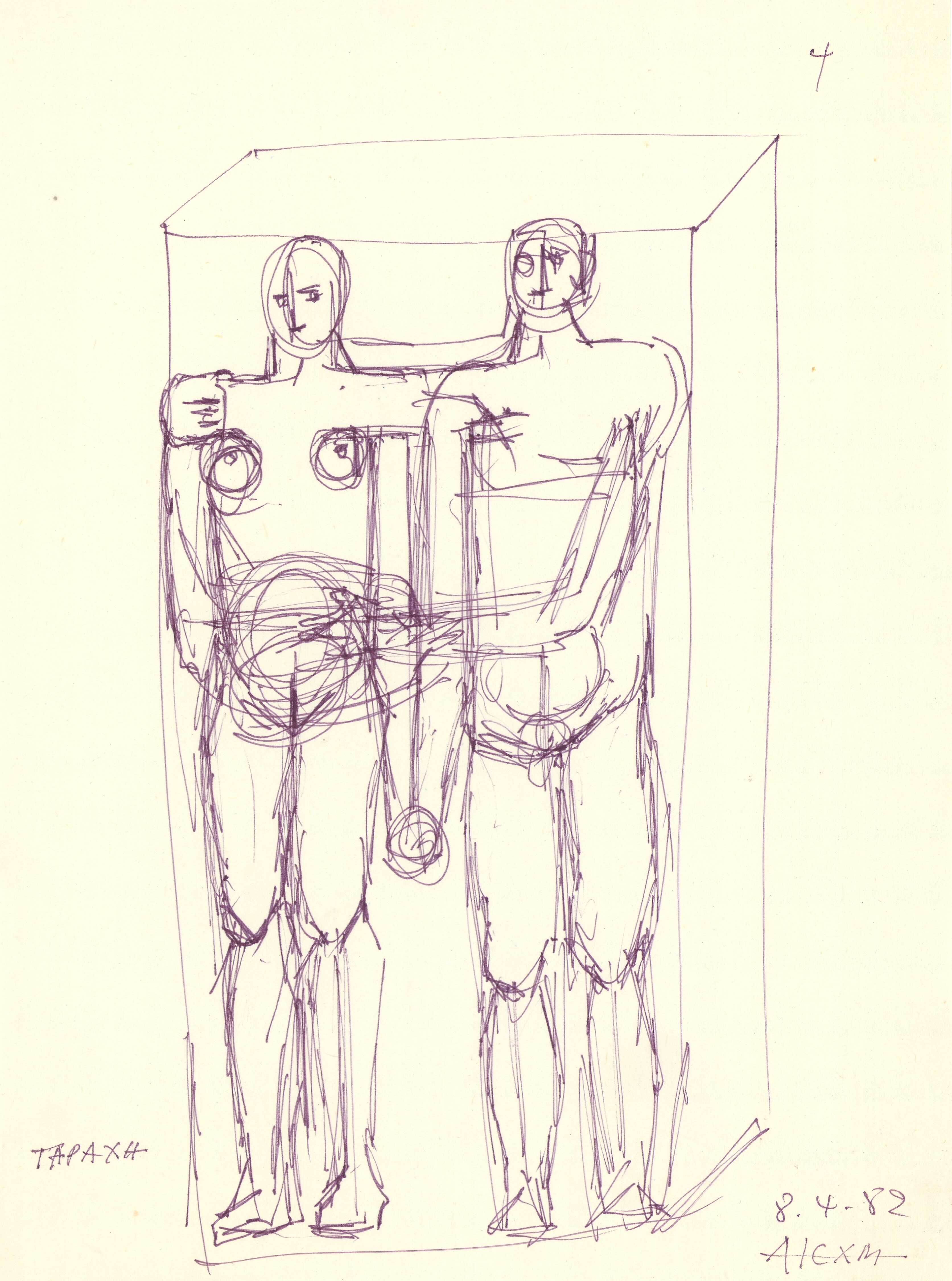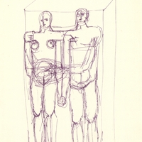 en Mylona encases two vertical figures held tightly together within the enormous rectangular volumes, yet another variation on her favorite motif: the couple.