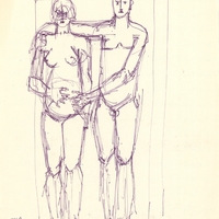 en Mylona encases two vertical figures holding each other tightly within the enormous rectangular volumes, yet another variation on her favorite motif: the couple. The male figure reaches out his arm to embrace his pregnant partner.