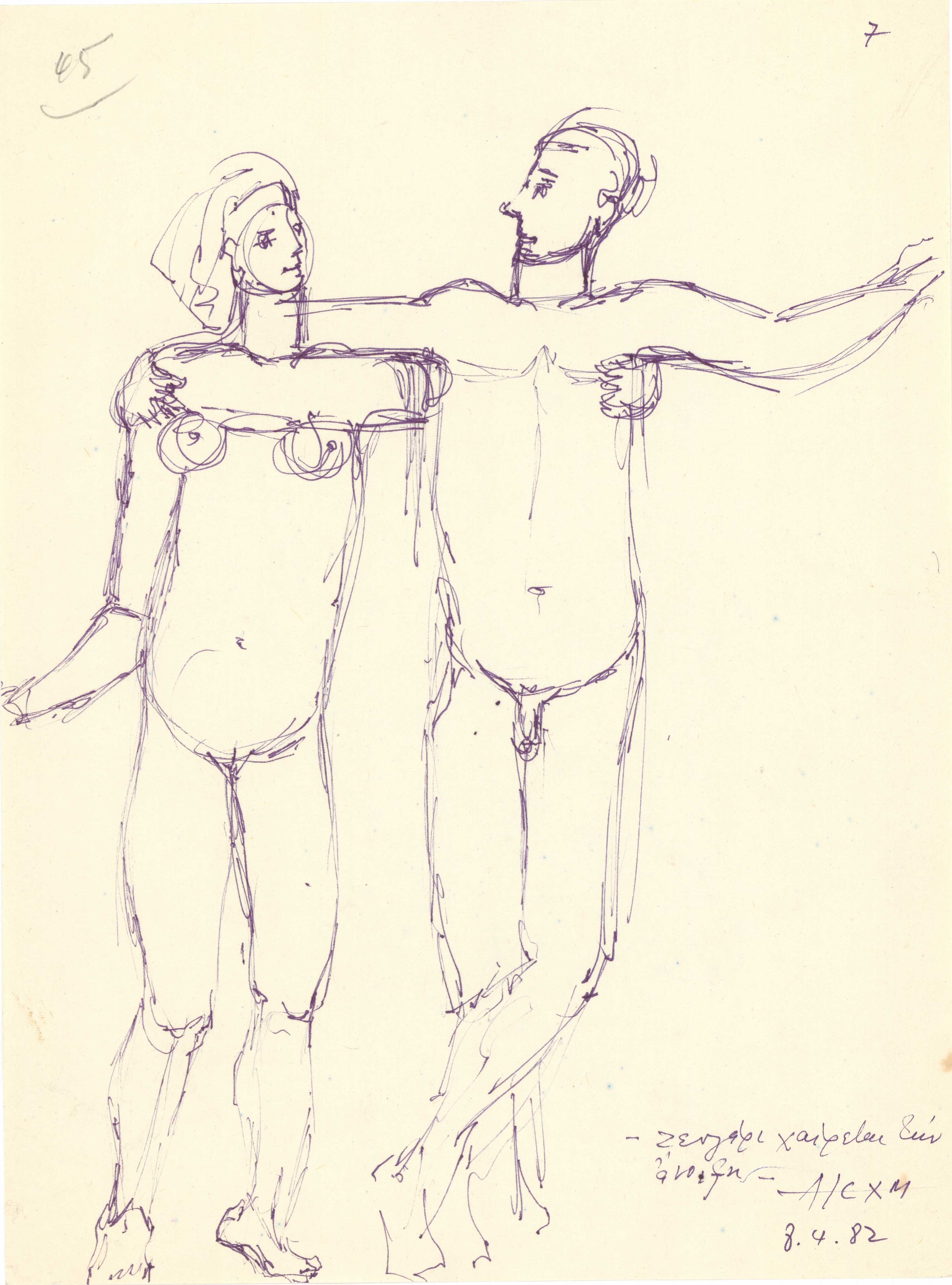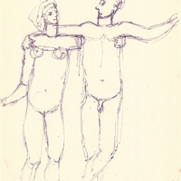 en Study of a couple, depicted embracing each other by the shoulders. They appear facing the viewer, while their faces and gazes are turned toward each other. Their relaxed posture is reminiscent of a dance pose.