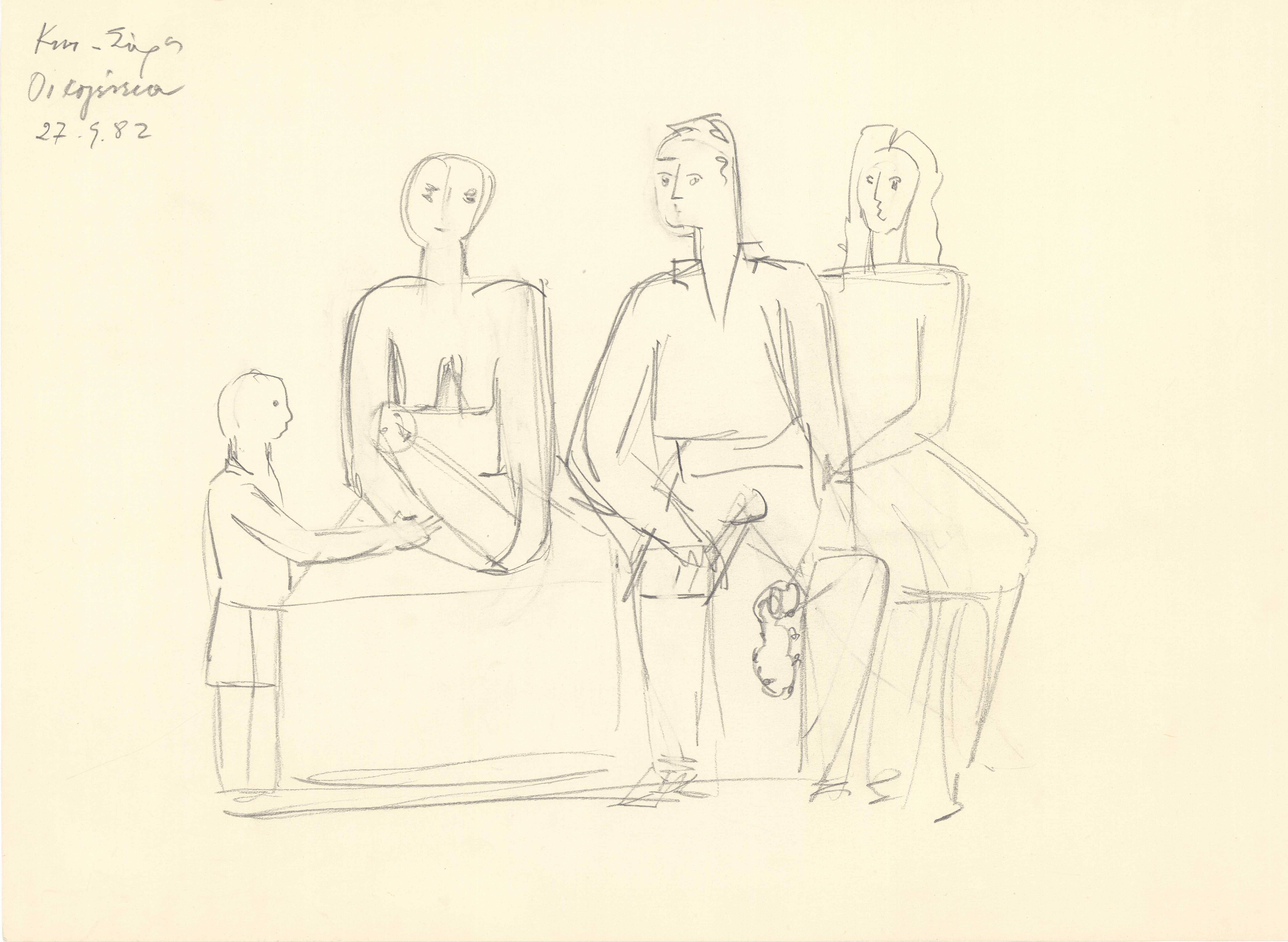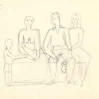 el Οικογενειακή συνάθροιση, στην οποία οι ενήλικες μορφές εμφανίζονται καθισμένες, ενώ τα νεαρά μέλη απεικονίζονται όρθια. Η γυναικεία φιγούρα κρατά στα χέρια της ένα μικρό μωρό.