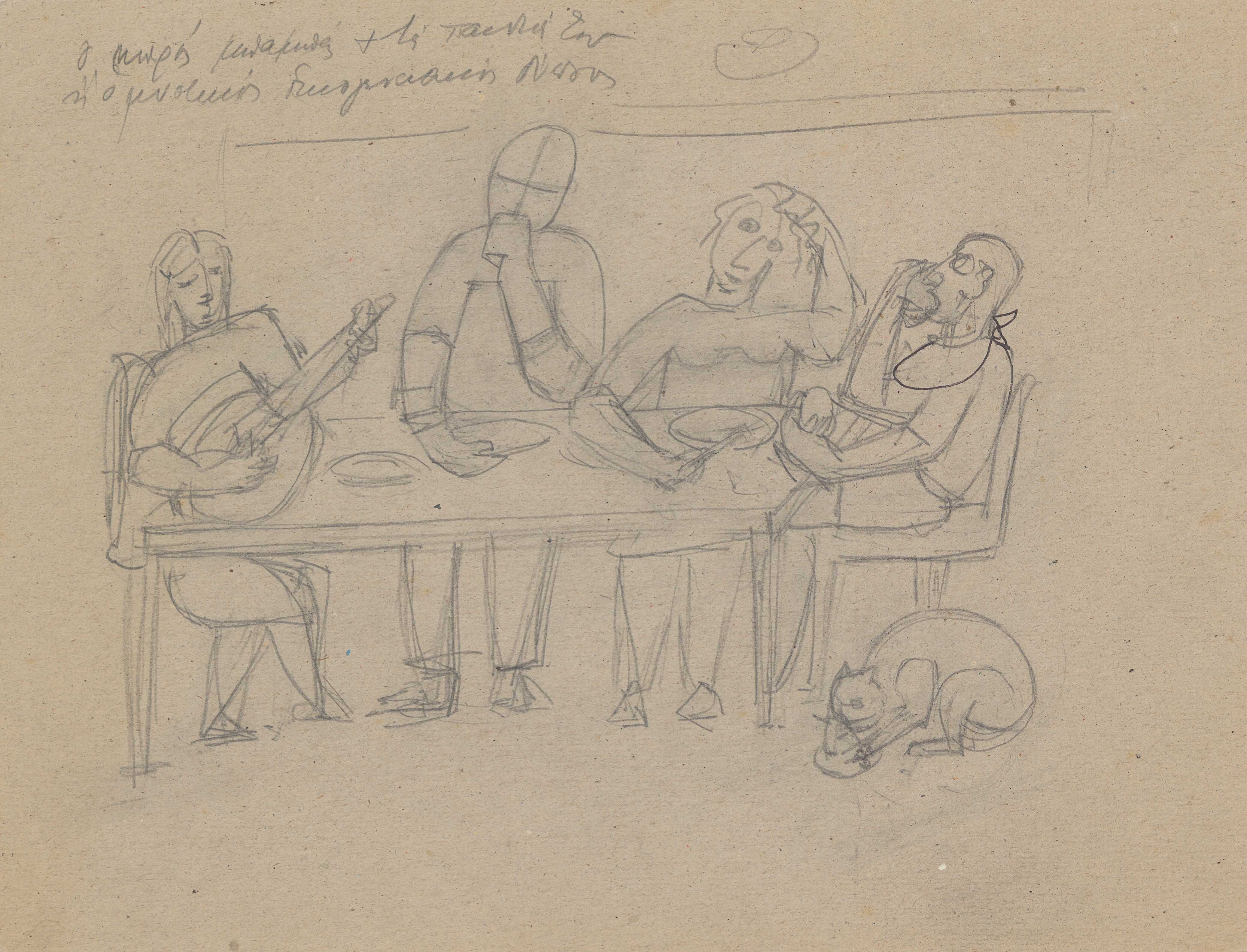 el Συνάθροιση της οικογένειας γύρω από το τραπέζι. Απεικόνιση μιας χαλαρής οικογενειακής στιγμής, όπου ένα από τα μέλη παίζει μουσική.