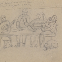 en Family gathering around the table. Depiction of a relaxed family moment, where one of the members is playing music.