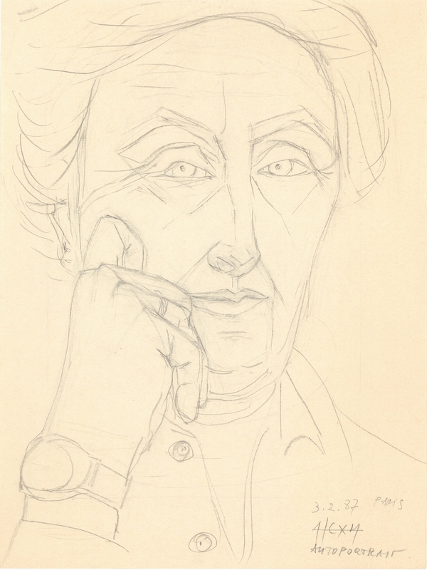 el Η καλλιτέχνιδα αποτυπώνει το 1998 την αυτοπροσωπογραφία της σε ώριμη ηλικία. Μέσα σε μια σύνθεση εντελώς νατουραλιστική αποτυπώνει τα φυσικά χαρακτηριστικά της, χωρίς να έχει τη διάθεση να ωραιοποιήσει ή να αποκρύψει στοιχεία της εικόνας της.