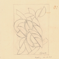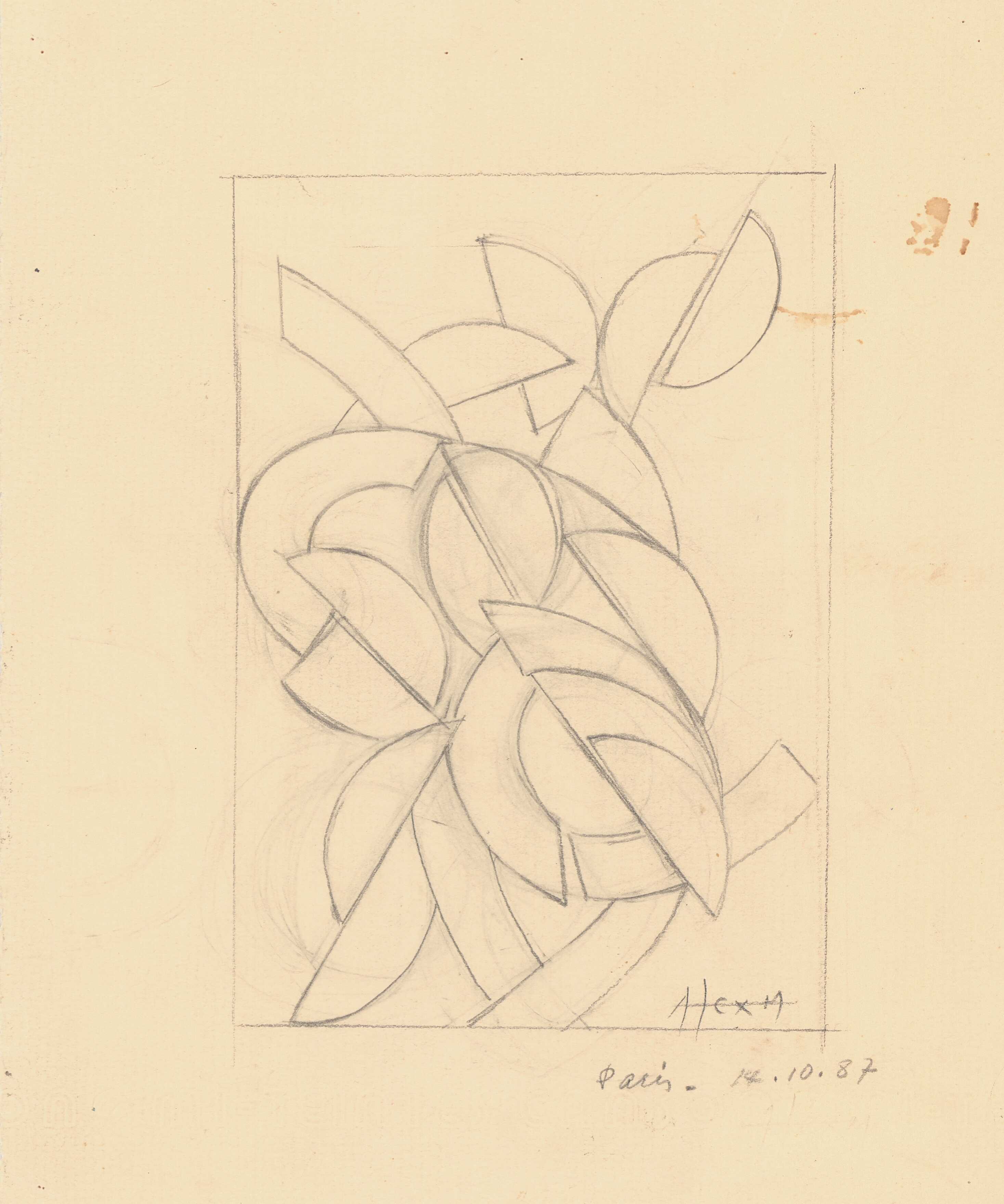 en Drawing by Alex Mylona for a relief. It is an abstract composition dominated by clean forms, curves, and semicircles, reminiscent of compositions she creates in aluminum, which are incorporated into flat stone surfaces, e.g., schist. The contrast between aluminum and stone clearly reveals the interplay between solid and void.