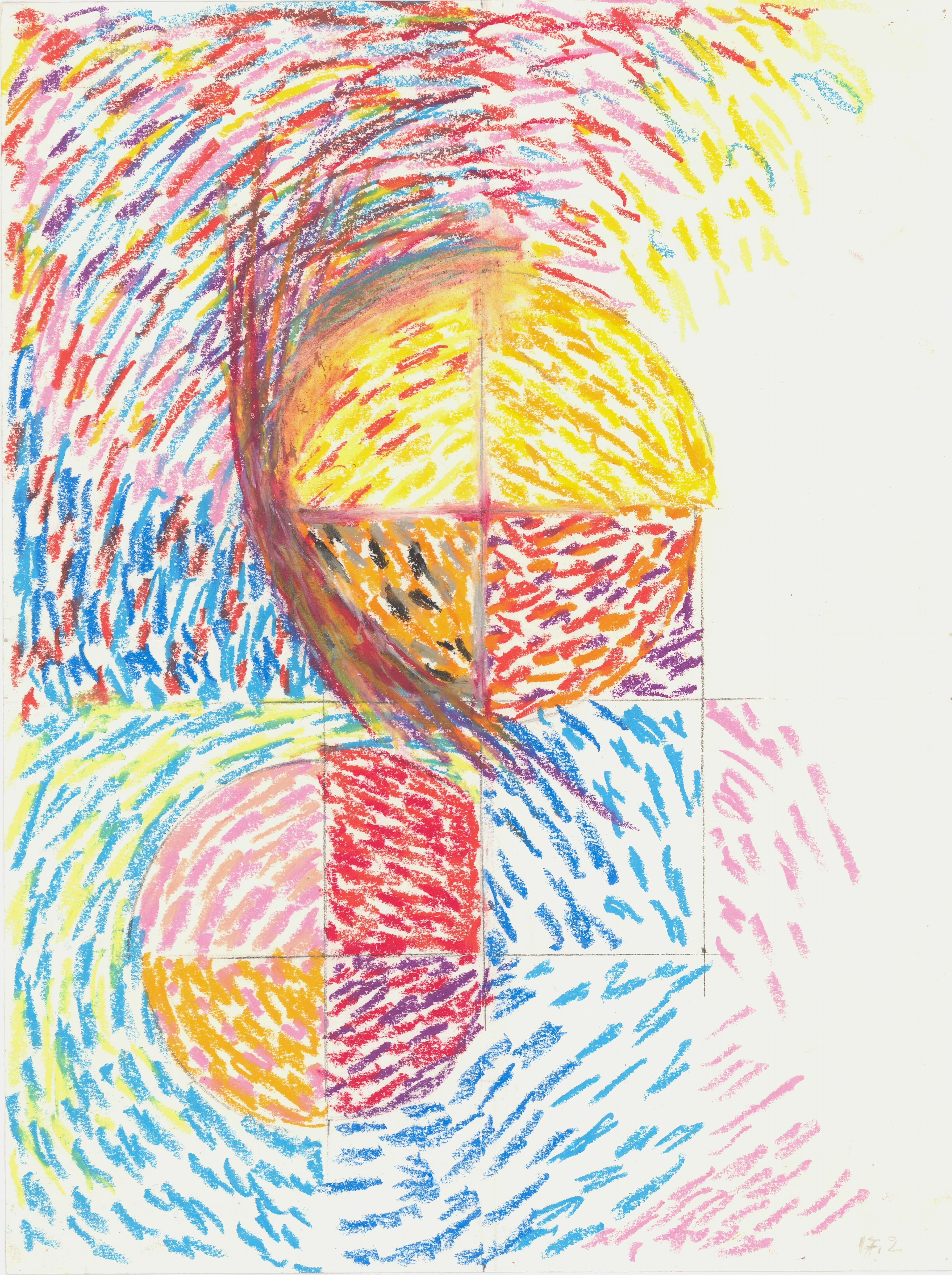 el Πολύχρωμη σύνθεση με δύο ήλιους. Πειραματισμοί της καλλιτέχνιδας με χρωματικούς τονισμούς και αποχρώσεις.