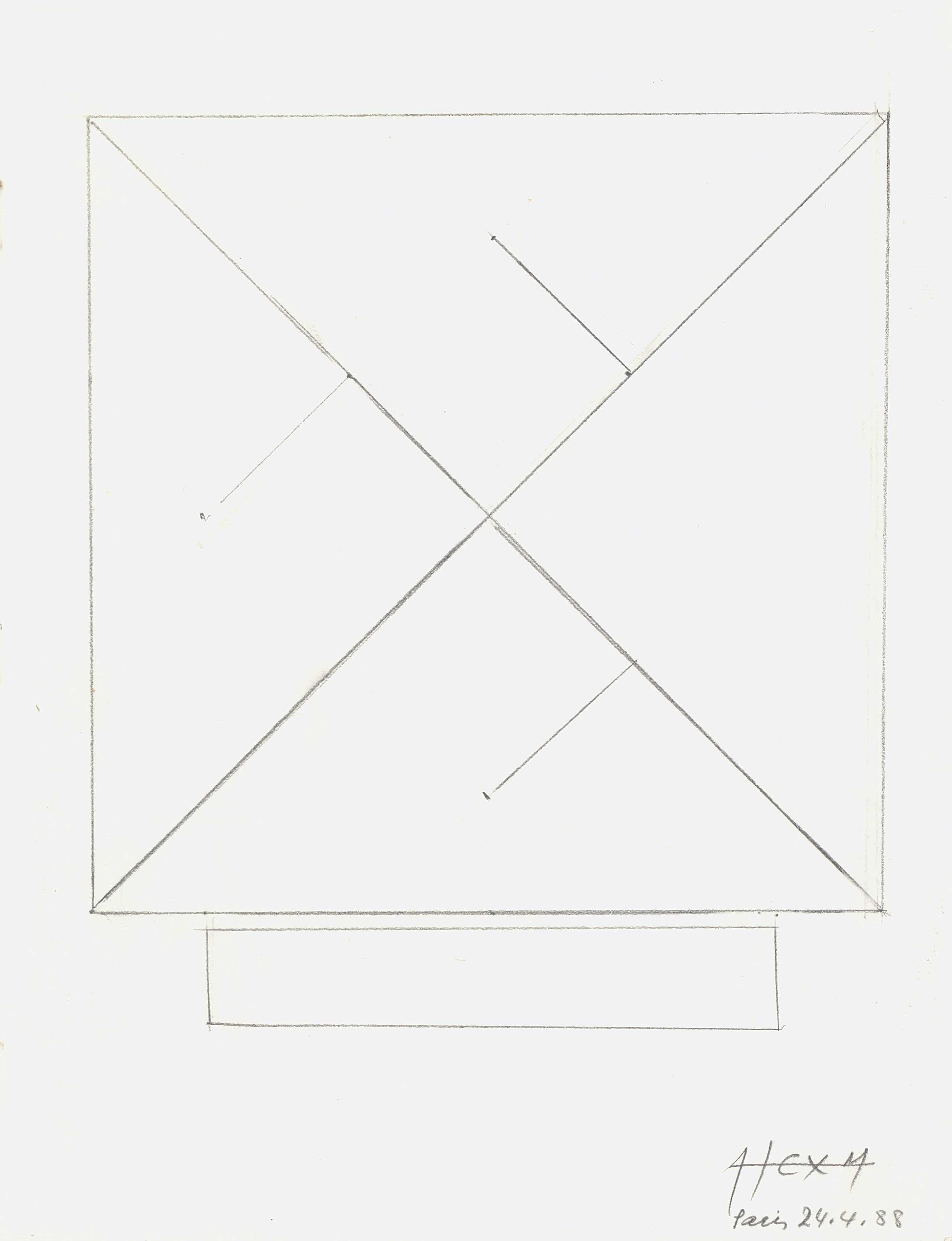 en Notebook with 7 sketches. Geometric composition with a square layout, dominated by diagonal lines that define the interior space of the geometric shape.