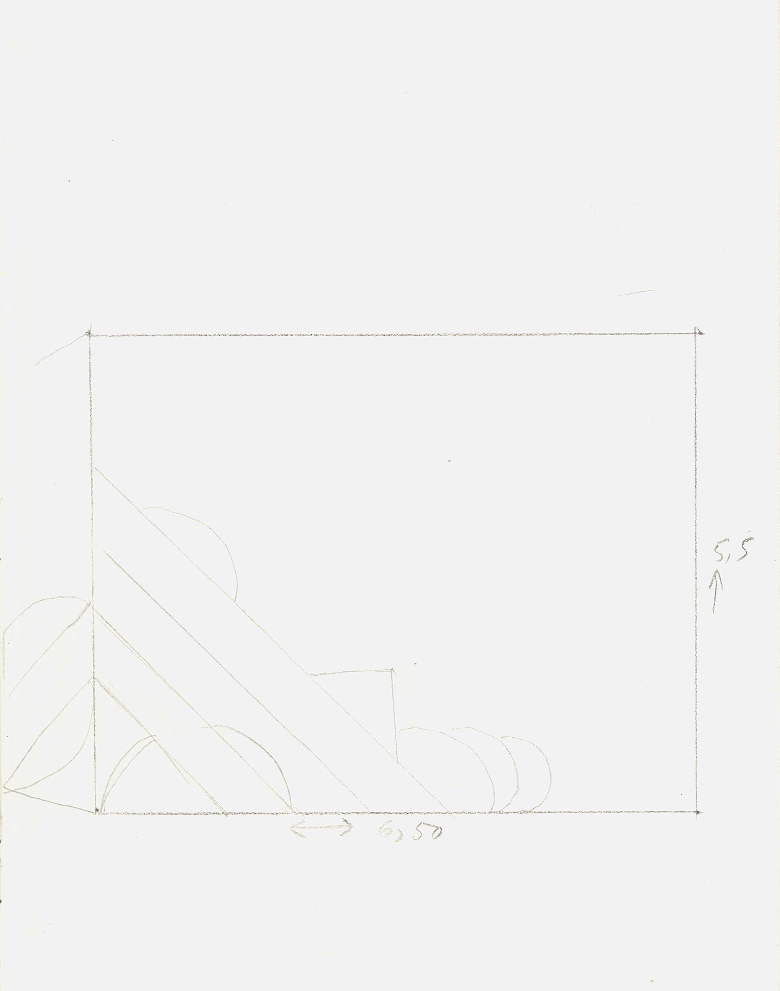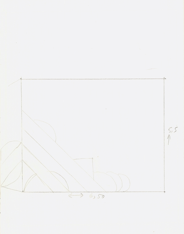 en Notebook with 7 sketches. Rectangular geometric composition, which develops on the left side with diagonal and curved lines.