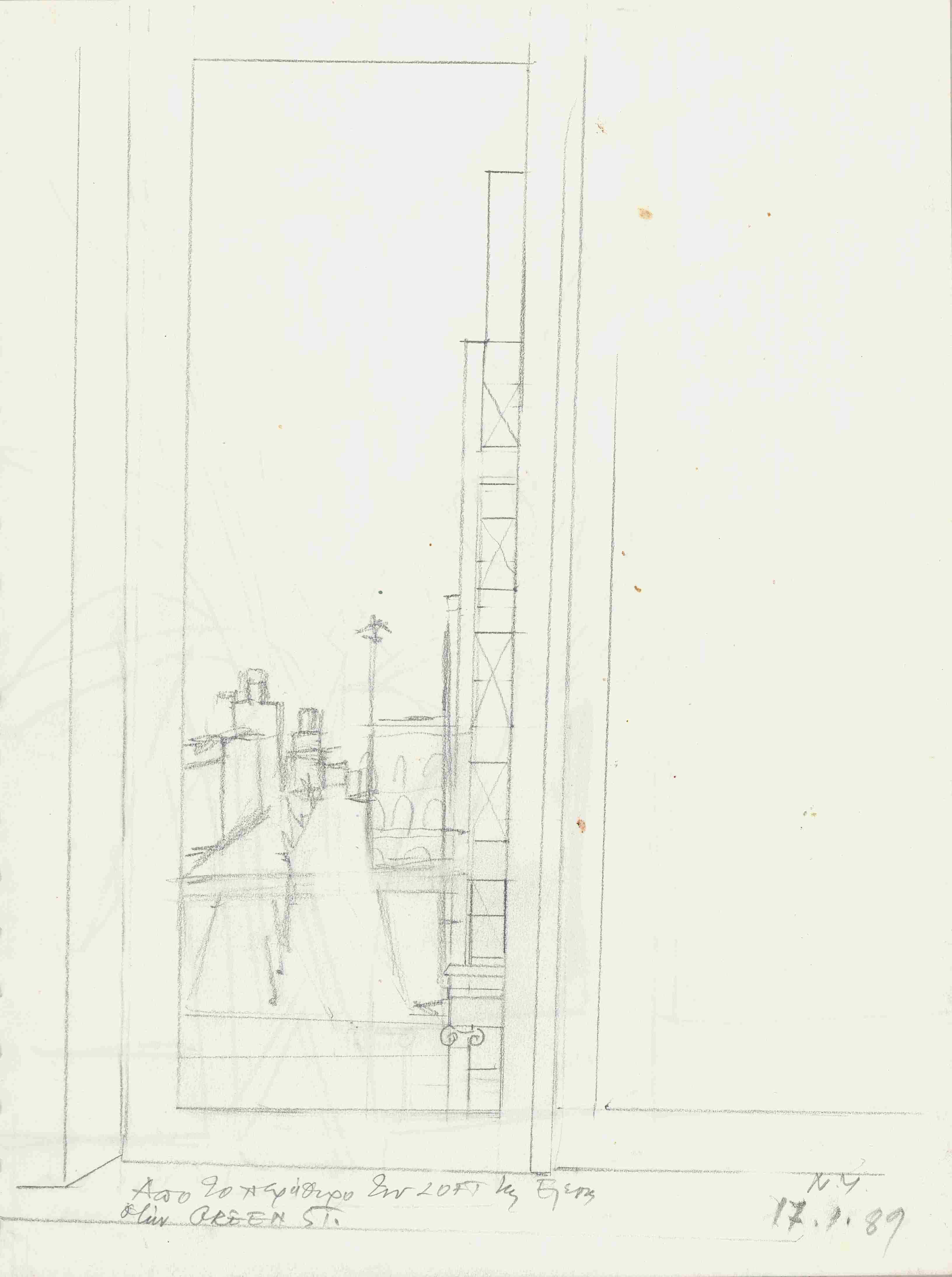 el Άποψη της θέας από το παράθυρο του σπιτιού της Ελένης, όπου διακρίνονται χωρίς λεπτομέρειες απόψεις του δρόμου.