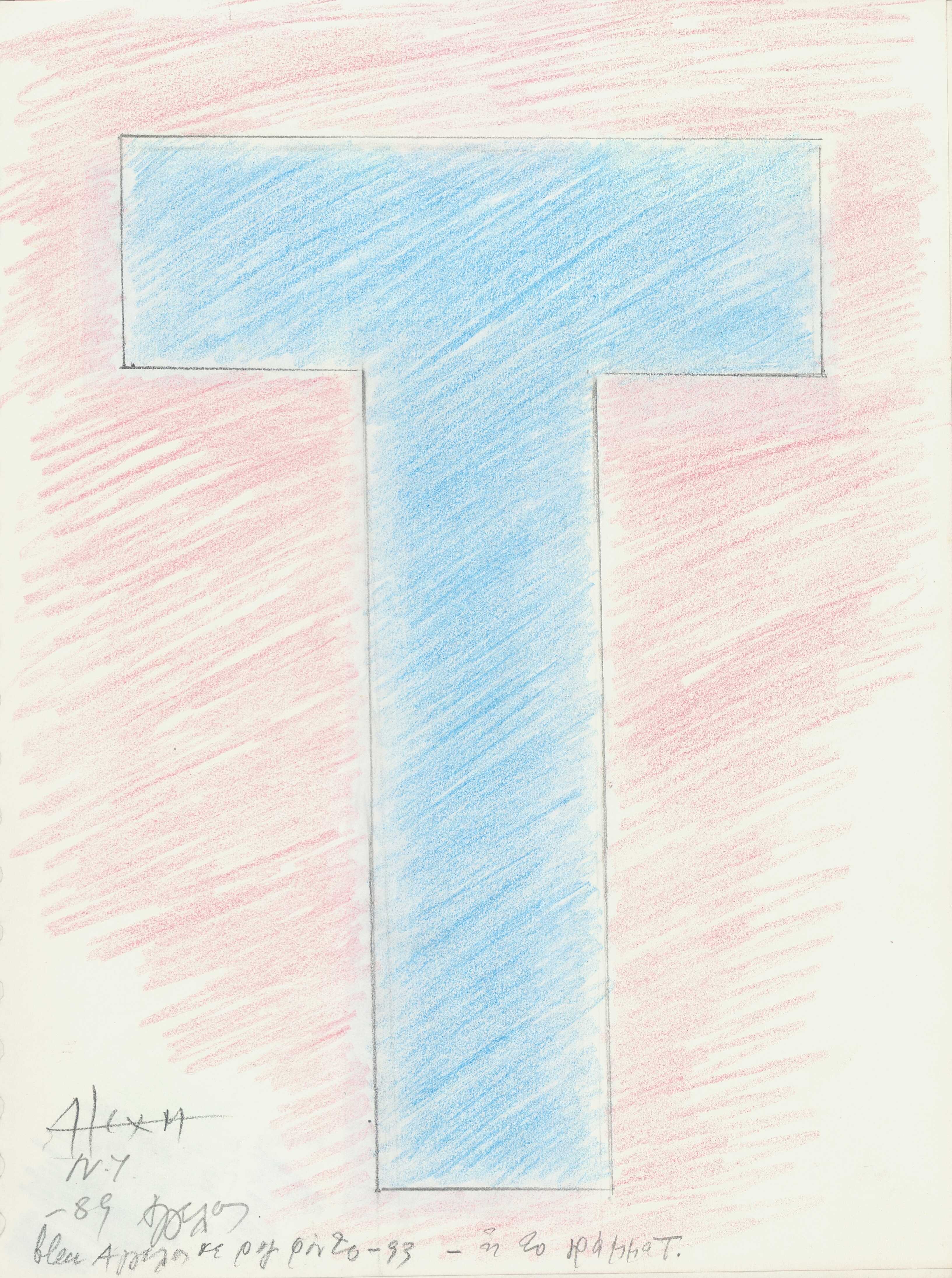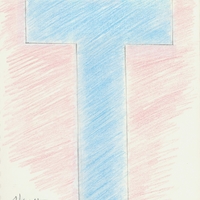 en Geometric composition in light blue on a pink background, study for the series of sculptures "Angels" and "Kouros." As the artist herself notes, the design was executed in marble in 1993 and is titled "Kouros I." In the early 1990s, Mylona created the series of works "Angels" and "Kouroi" in transparent marble, which are characterized by minimalist and austere lines and absolute geometry. Later, in 1997, she created the works "Kouros" and "Kori," returning to representationalism, stylized forms, and archaic models.