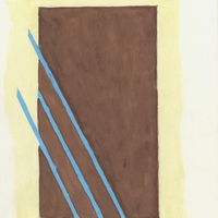 en An abstract composition dominated by geometric shapes and straight diagonal lines, which, as she herself notes, serves as a study in color.