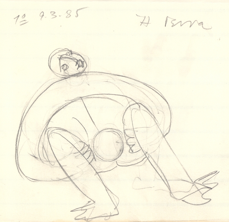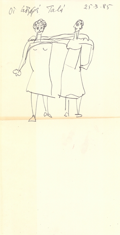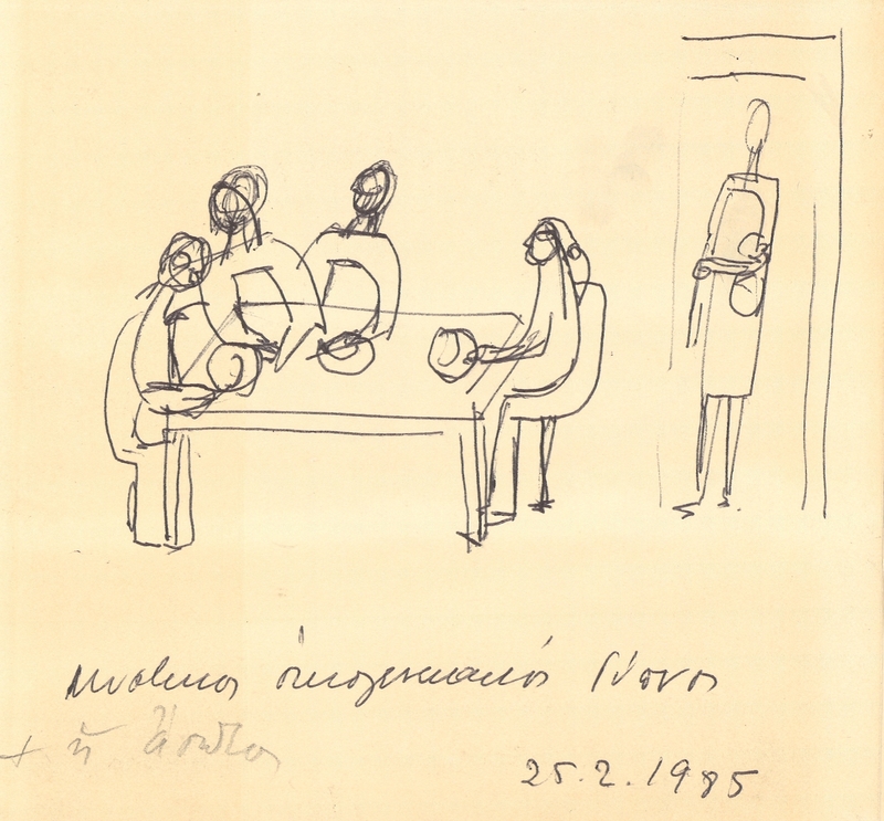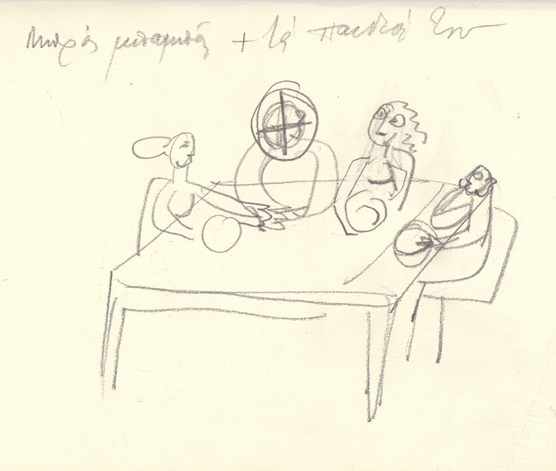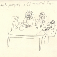 el Η Άλεξ Μυλωνά δημιουργεί μια σειρά σχεδίων σε χαρτί, το οποίο στη συνέχεια διπλώνει και γίνεται σαν ένα μικρό τετράδιο. Στο σχέδιο αυτό απεικονίζεται μια συνάθροιση γύρω από το τραπέζι. Η απεικόνιση λιτή παρουσιάζει μόνο τα απαραίτητα στοιχεία χωρίς να μας δίνει περισσότερες πληροφορίες για τον χώρο και τα πρόσωπα.