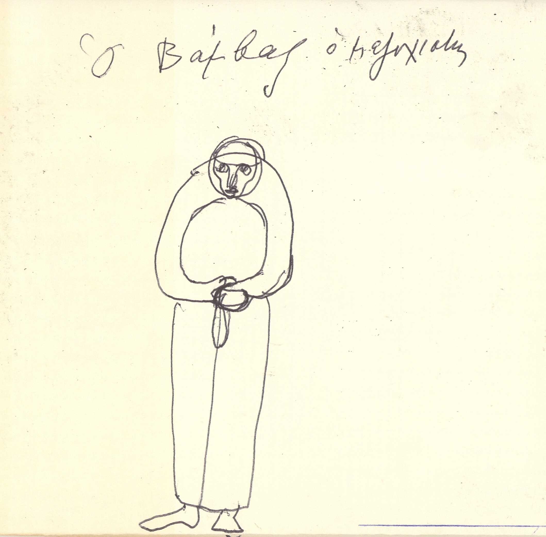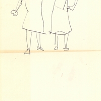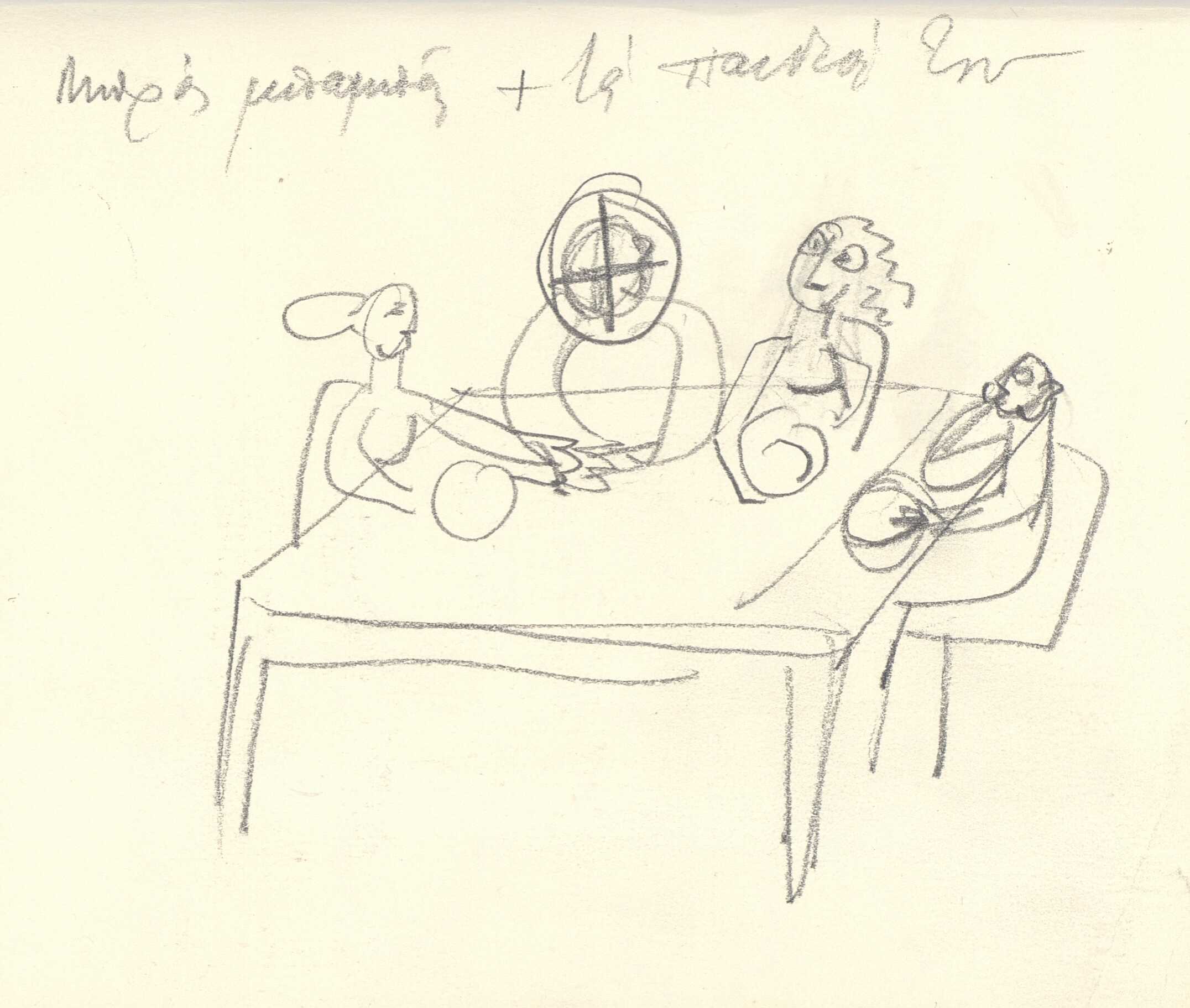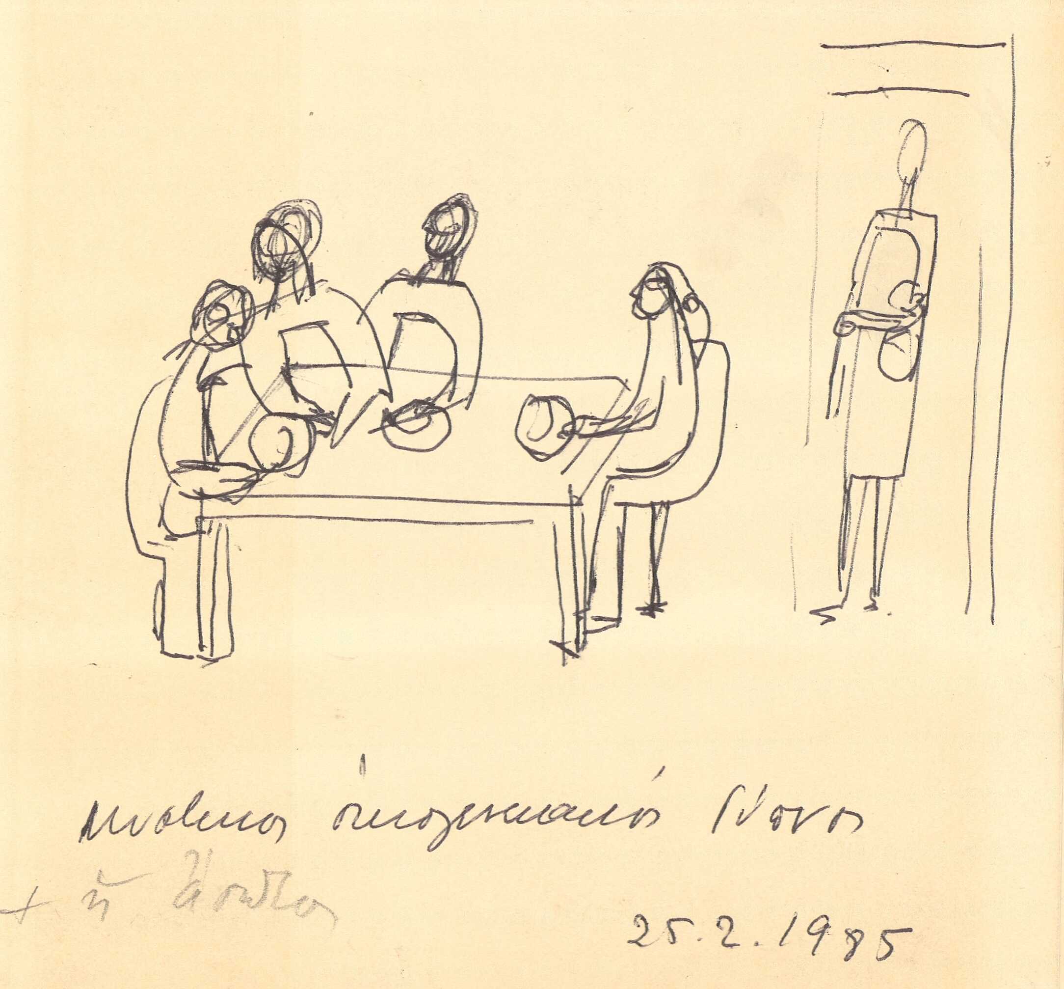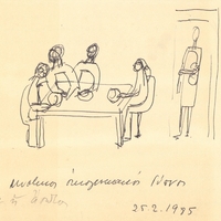 en Alex Mylona creates a series of drawings on paper, which she then folds into a small notebook. This drawing depicts a gathering around a table. The simple illustration shows only the essential elements without giving us any further information about the space and the people.
