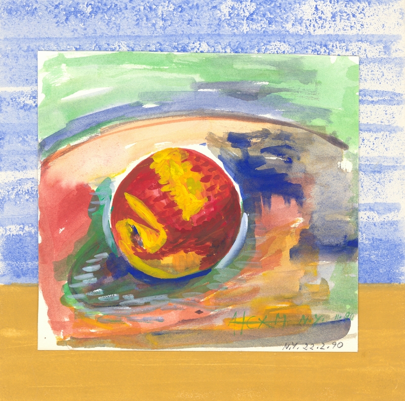 el Μελέτη νεκρής φύσης με φρούτο. Η καλλιτέχνιδα δημιουργεί μια νεκρή φύση με φρούτο, το οποίο εντάσσει σε ένα απροσδιόριστο περιβάλλον, που χαρακτηρίζεται από έντονη χρωματική ποικιλία, σαν να επρόκειτο για μελέτες χρωμάτων.