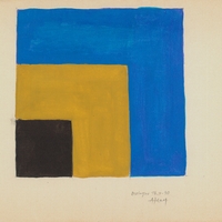 en An abstract geometric composition, characterized by chromatic simplicity and the arrangement of overlapping lines to form a square.
