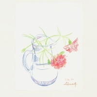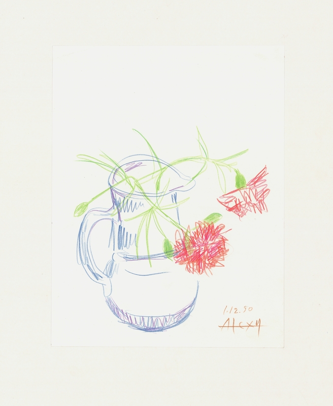el Μελέτη νεκρής φύσης με φρούτα σε καλάθι με χρωματιστά μολύβια. Η καλλιτέχνιδα αποδίδει τη σύνθεση σε απροσδιόριστο "κενό" φόντο, φροντίζοντας παρόλα αυτά με γρήγορες μολυβιές να αποδώσει μια υποτυπώδη σκιαγράφηση.