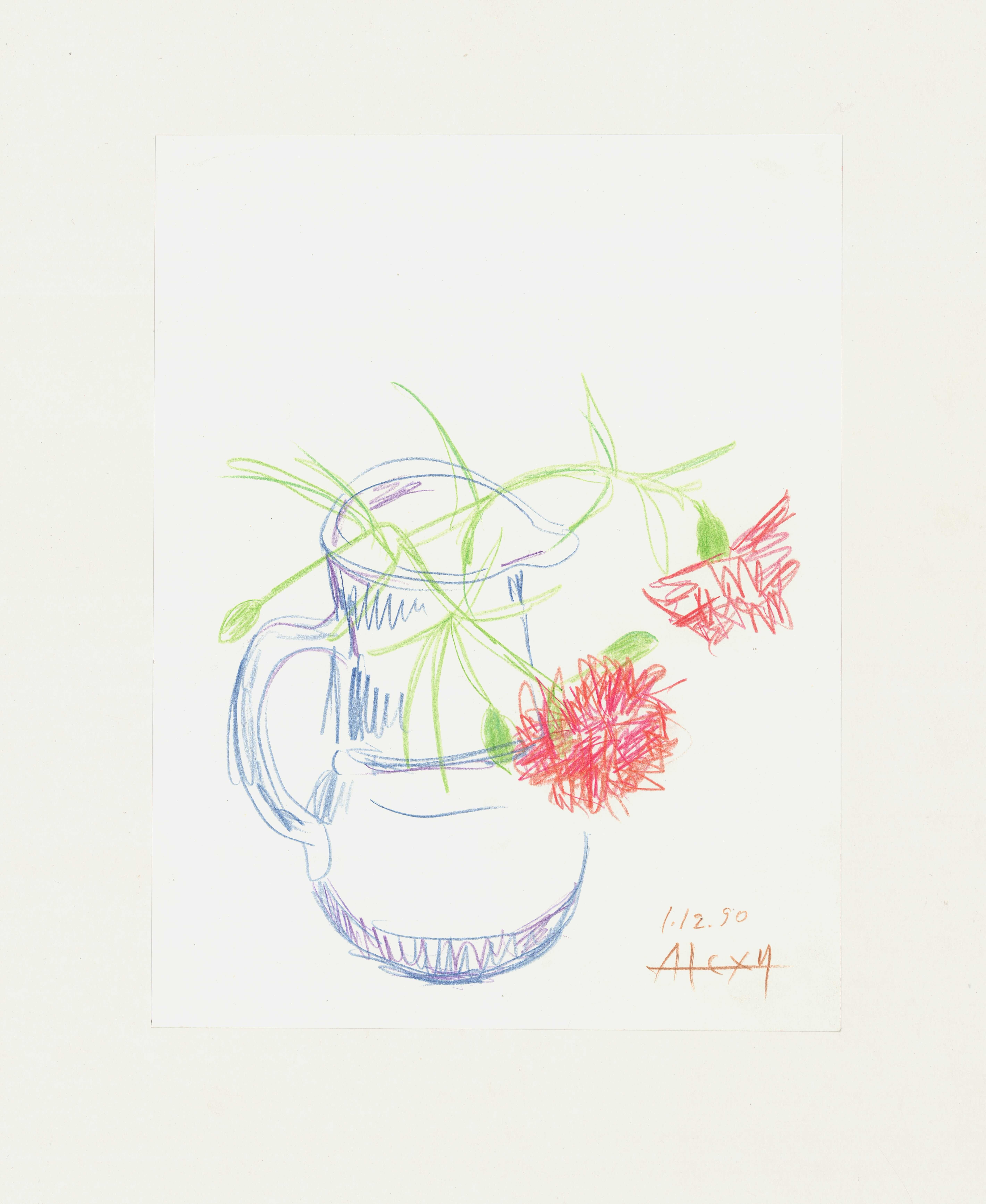 em Μελέτη νεκρής φύσης με γαρύφαλλα με χρωματιστά μολύβια. Λιτή απεικόνιση της σύνθεσης σε λευκό φόντο, δίνοντας κατεξοχήν βαρύτητα στο απεικονιζόμενο θέμα.