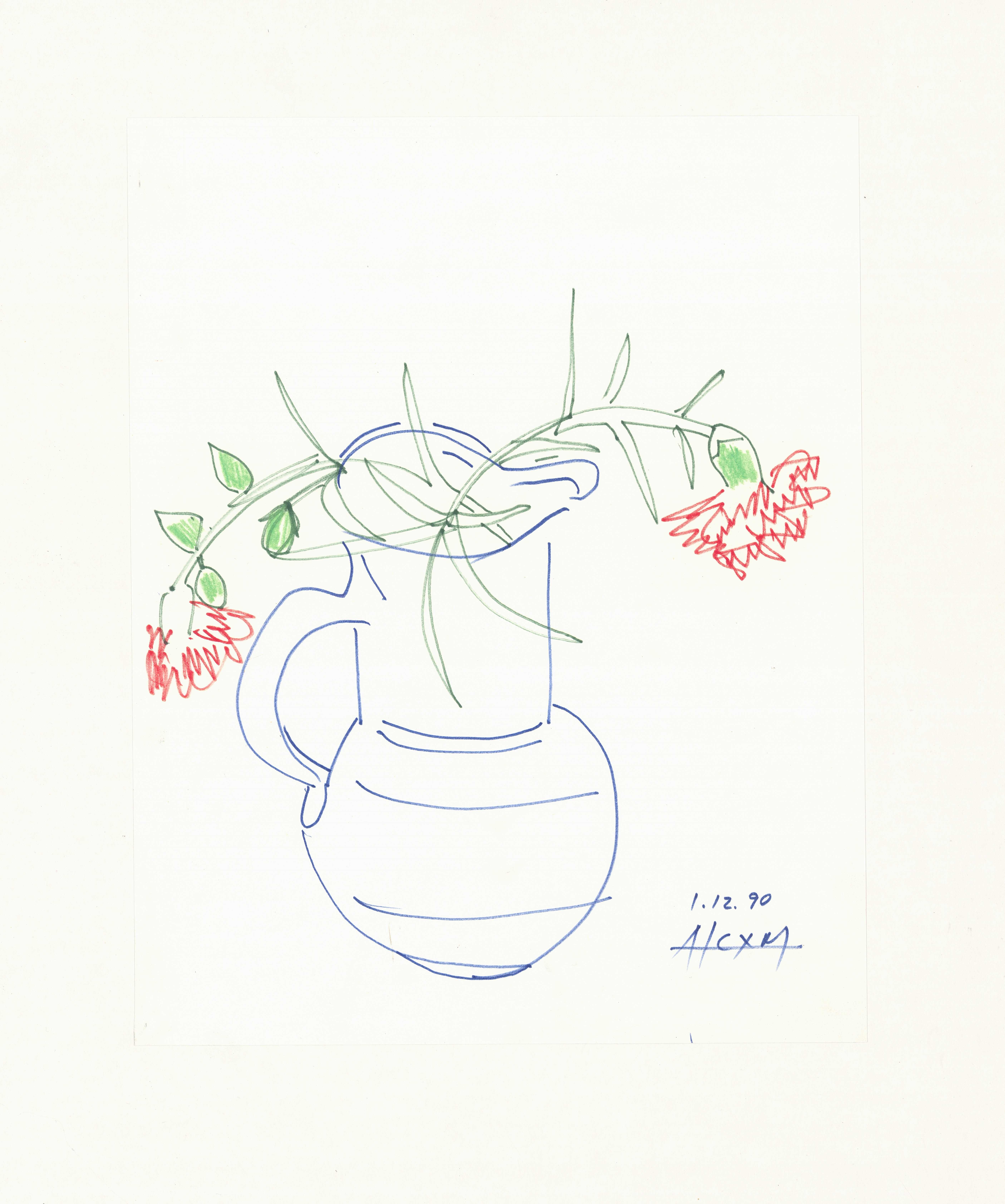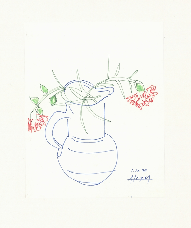 el Μελέτη νεκρής φύσης με φρούτα σε καλάθι με χρωματιστά μολύβια. Η καλλιτέχνιδα αποδίδει τη σύνθεση σε απροσδιόριστο "κενό" φόντο, φροντίζοντας παρόλα αυτά με γρήγορες μολυβιές να αποδώσει μια υποτυπώδη σκιαγράφηση.