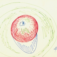 el Σύνθεση νεκρής φύσης με μήλο σε πράσινο πιάτο. Η καλλιτέχνιδα με γρήγορες κινήσεις του ζωγραφικού μέσου δημιουργεί μια αφαιρετική, λιτή σύνθεση νεκρής φύσης, όπου αποτυπώνει ένα φρούτο επάνω σε μια πράσινη επιφάνεια. Ο περιβάλλων χώρος, το φόντο παραμένουν απροσδιόριστα.