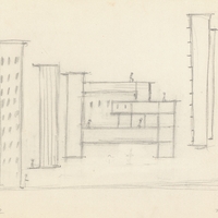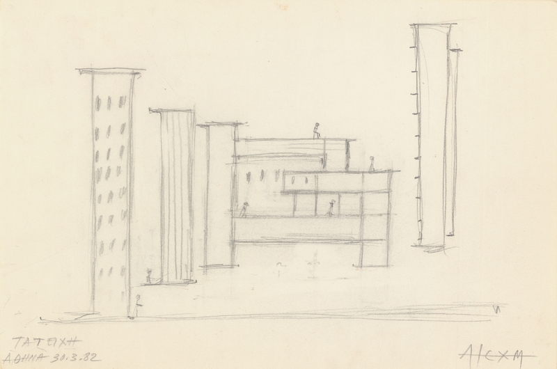 el Το συγκεκριμένο σχέδιο αποτελεί μία εκδοχή για το μαρμάρινο γλυπτό με τίτλο "Τα Τείχη". Η καλλιτέχνιδα στην ενότητα των μαρμάρινων γλυπτών της, για τα οποία πολύ συχνά χρησιμοποιεί το λευκό μάρμαρο των λατομείων του Διονύσου, αντιλαμβάνεται πως δεν του ταιριάζουν τα πολύπλοκα σχήματα, καθώς θα έκρυβαν την ομορφιά του, την λαμπερότητα, τη ζωντανιά του. Διαμορφώνει καθαρά γεωμετρικά σχήματα: τετράγωνα, ορθογώνια παραλληλόγραμμα, τα οποία είναι επάλληλα τοποθετημένα με σκοπό να προκαλέσουν το αίσθημα της απομόνωσης, της ασφάλειας και της προστασίας, ότι ακριβώς προσφέρουν και τα τείχη με τη λειτουργία τους.
