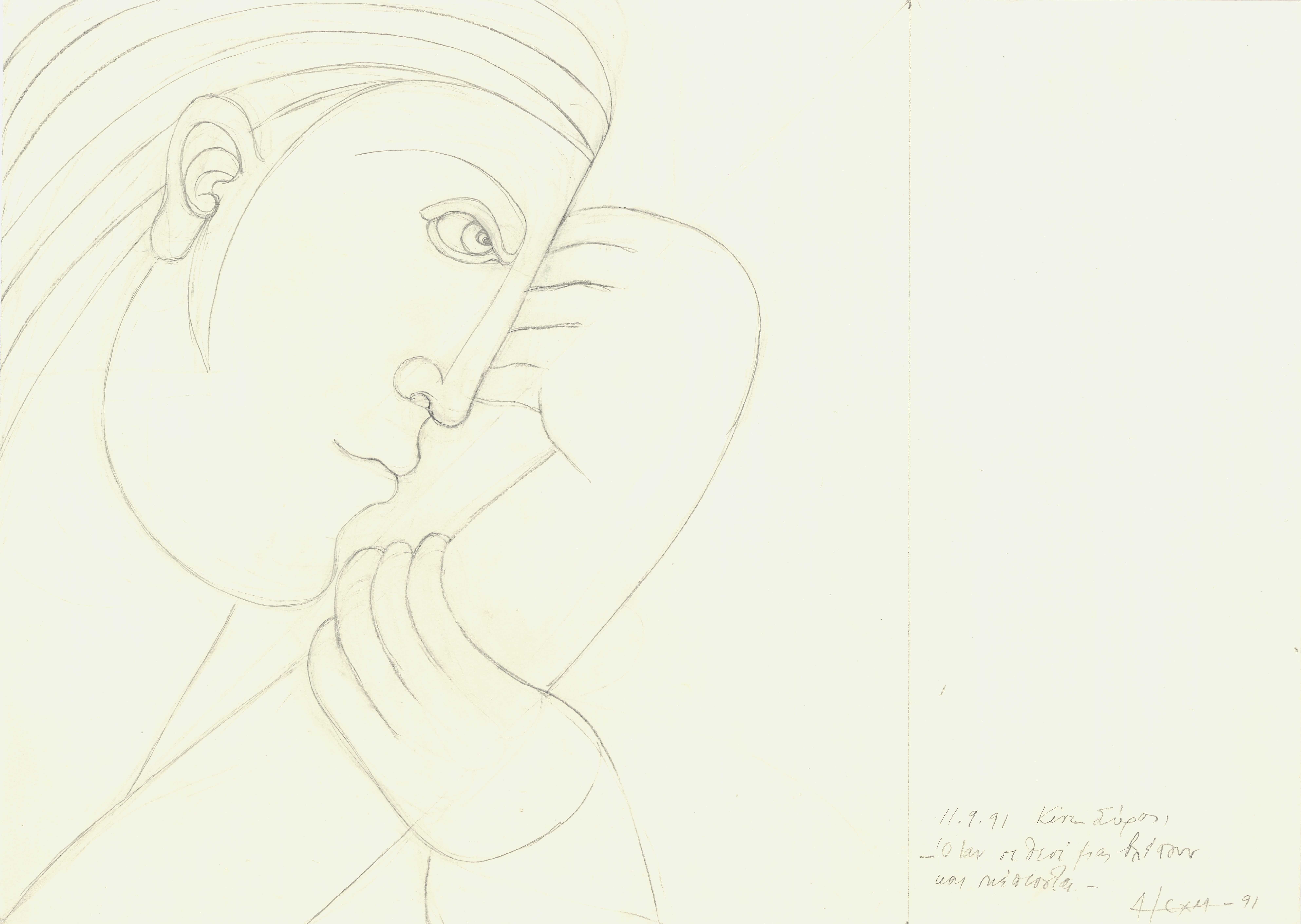en Study of a male portrait in contemplation, rendered in right profile. As the artist herself notes at the bottom of the work: "When the Gods see us and think," the male figure is depicted with a thoughtful expression, looking down, as if observing what is happening at a lower level.
