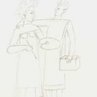 en A simple composition depicting two female figures standing side by side. The surrounding space remains undefined, with no way of telling whether it is indoors or outdoors, while the figures' posture suggests intimacy.