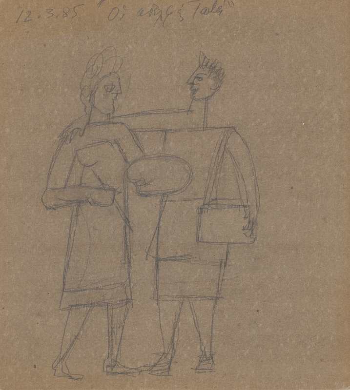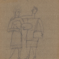 A simple composition depicting two female figures standing side by side. The surrounding space remains undefined, with no way of telling whether it is indoors or outdoors, while the figures' posture suggests intimacy.