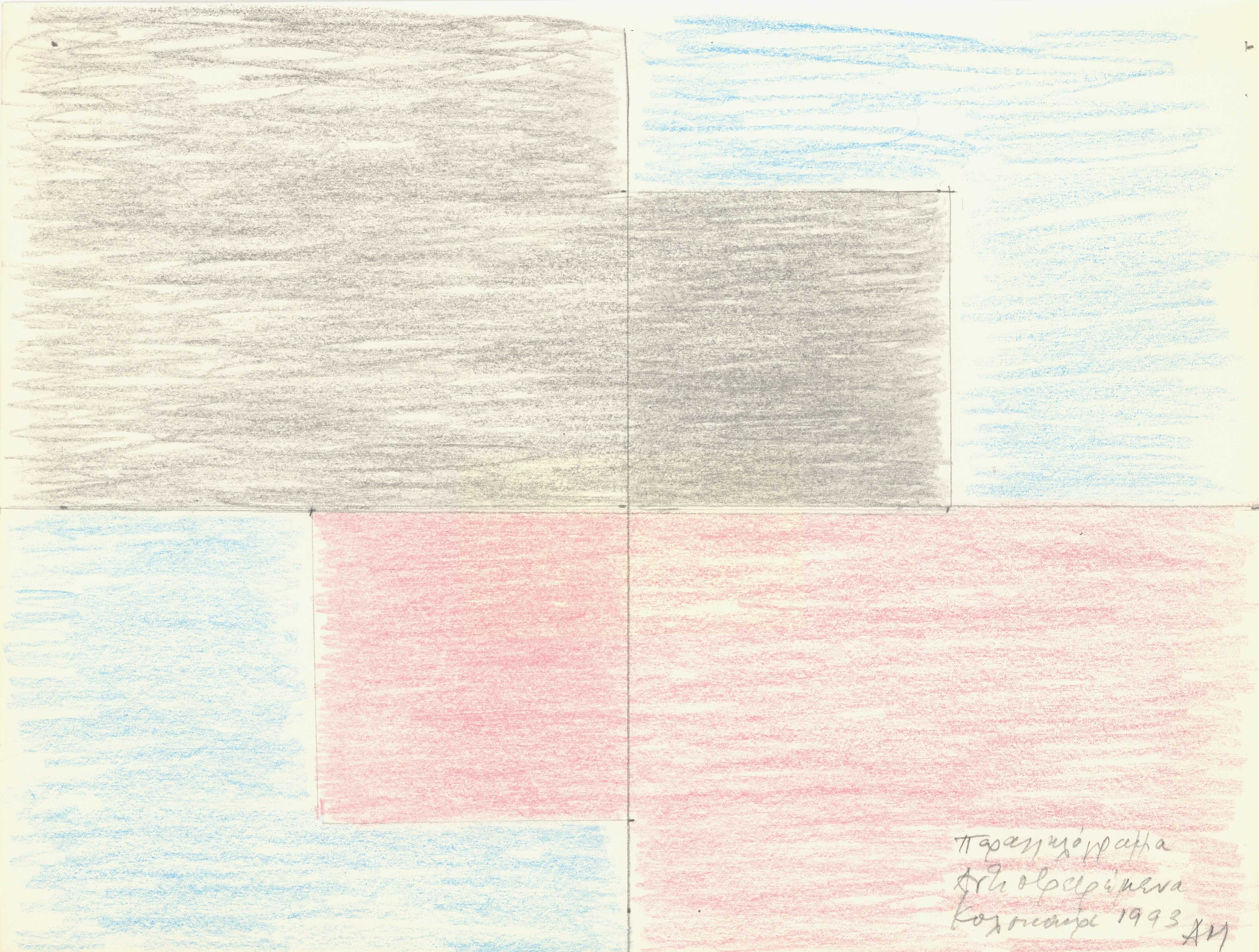 en In the studies "Parallelograms Reversed," the compositions are defined by straight and curved lines. The artist experiments with different colors in the same design pattern, creating a play of reflections. This condition preoccupies her intensely in her work, and particularly in her sculptures (e.g. Reversibles, 1986), as the interplay of empty and full, positive and negative, is what, according to Mylona, gives depth to frontality.