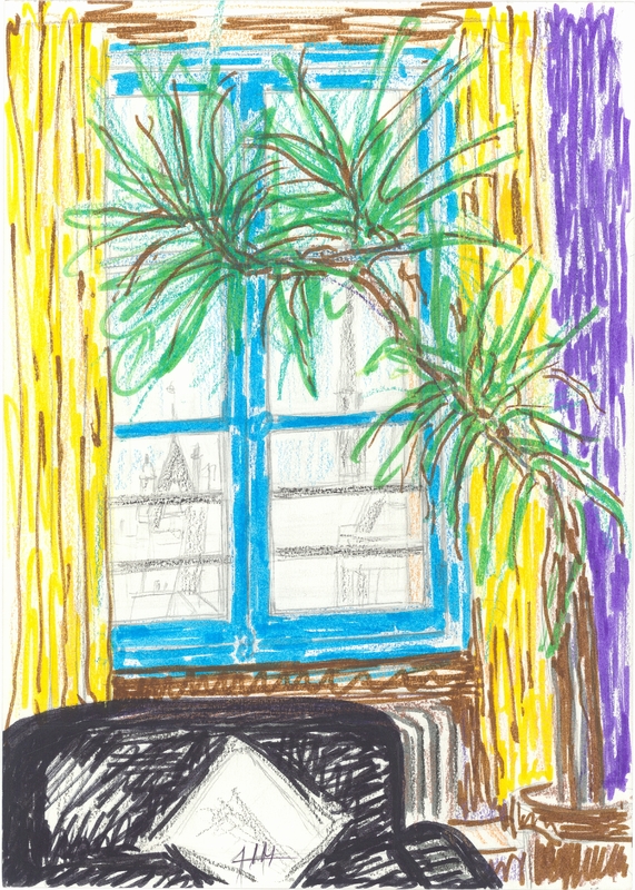 en Composition of an interior space dominated by the depiction of a window, which provides an abstract rendering of the exterior view. Several details are clearly discernible in the interior space, while a chromatic pluralism dominates.