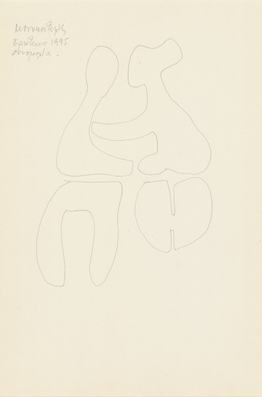en An abstract composition based on the juxtaposition of straight and curved shapes, an attempt to capture and negotiate the pictorial space through a study of planes, lines, and colors reminiscent of painting and sculpture studies in the late 1980s and early 1990s, where Mylonas negotiates the play of shape reversal and positive-negative contrast. Here, as the artist herself notes, it is a conversation between a couple, an "erotic" conversation.