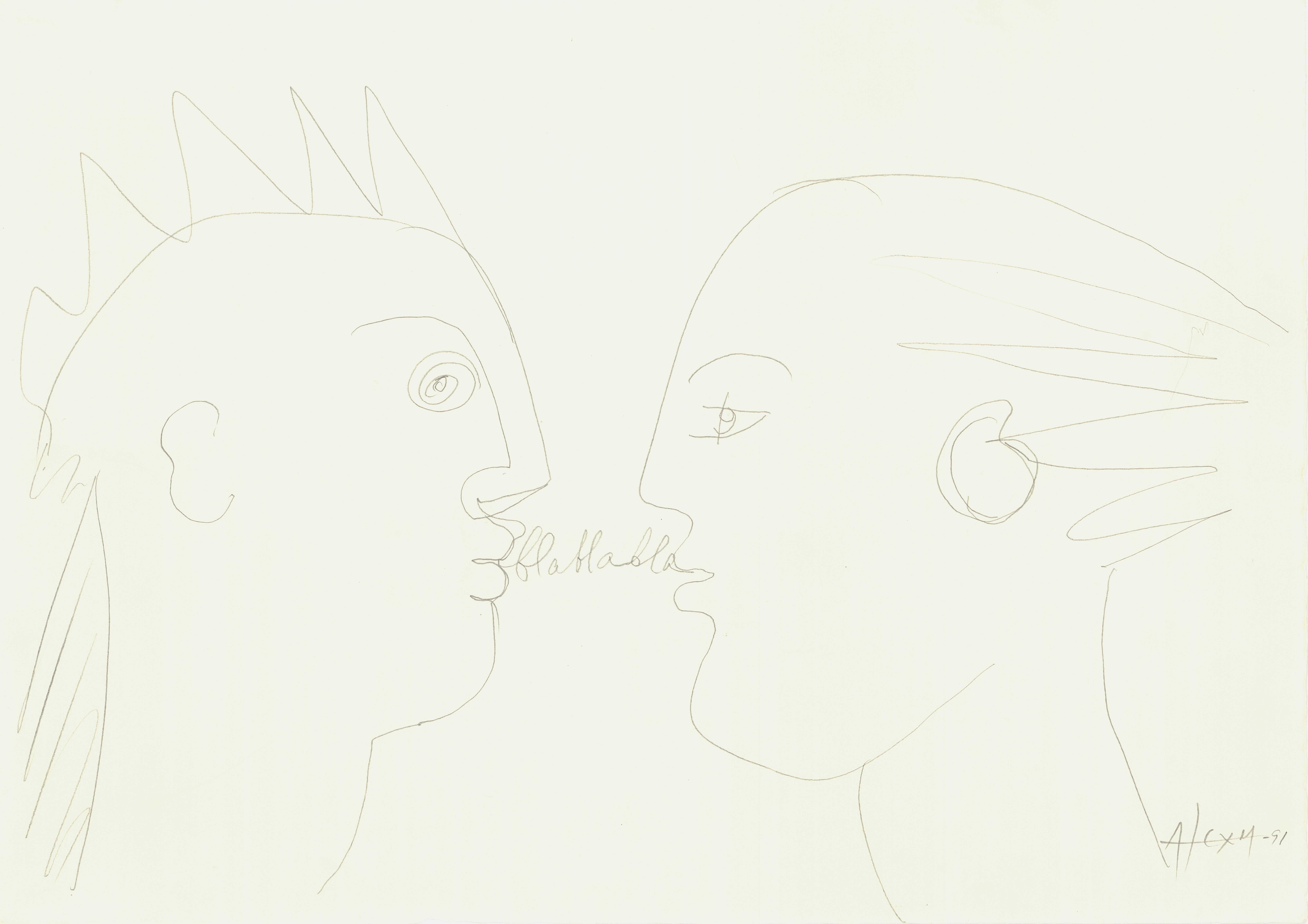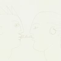 en Composition with two portraits, depicted in profile, facing each other in conversation.