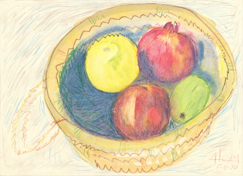 el Μελέτη νεκρής φύσης με φρουτιέρα και φρούτα. Η καλλιτέχνιδα αποτυπώνει μια νεκρή φύση με φρούτα, χρησιμοποιώντας χωρίς φειδώ το χρώμα στη σύνθεσή της, ενώ το φόντο είναι απροσδιόριστο.