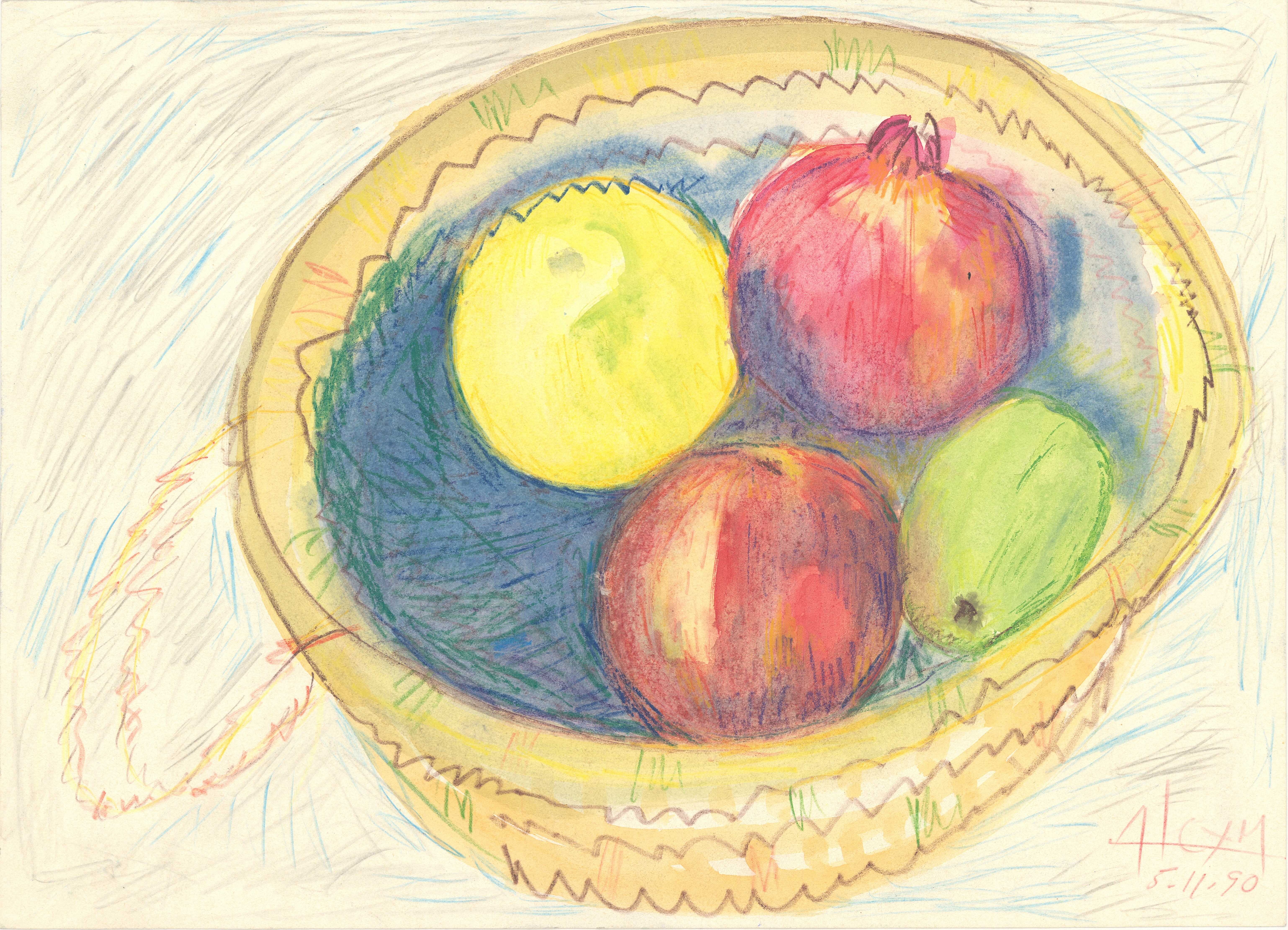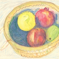 en Still life study with fruit bowl and fruit. The artist depicts a still life with fruit, using color liberally in her composition, while the background is undefined.