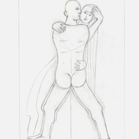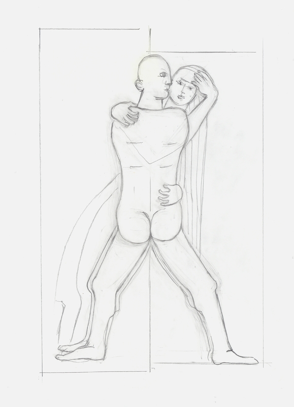 en Study of a couple. Pencil drawing, dominated in the center of the composition by a male figure, who appears to be embracing a female figure behind him.