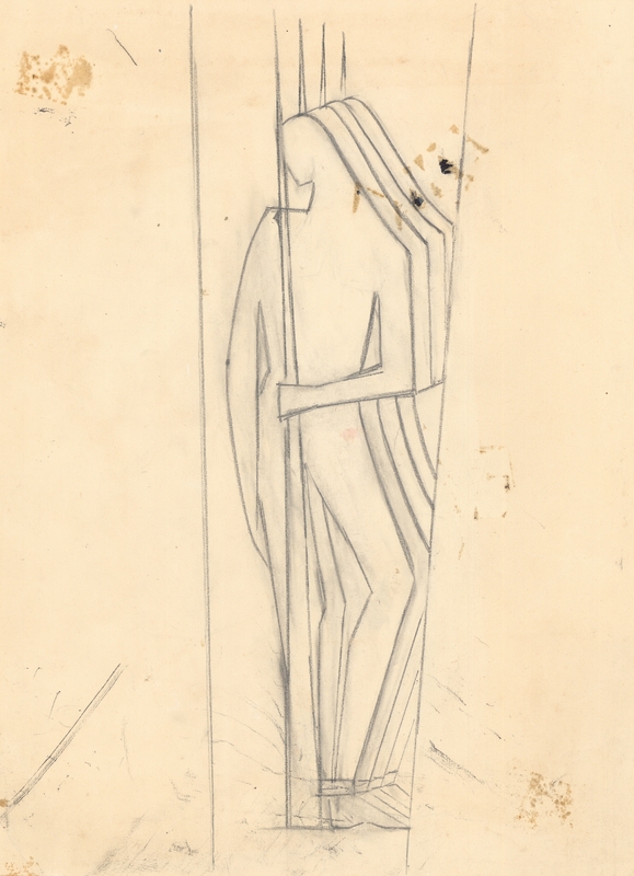 el Μελέτη γλυπτού. Το σχέδιο χαρακτηρίζεται από τη γραμμικότητα της σύνθεσης με τις λιτές ευθείες και καμπύλες γραμμές που δημιουργούν μια μορφή που κινείται στα πλαίσια της γεωμετρικής αφαίρεσης.