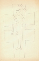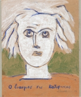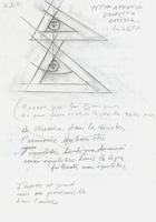 Σχέδιο με μολύβι, όπου απεικονίζεται σύνθεση επάλληλων γεωμετρικών τριγωνικών σχημάτων, η οποία συνοδεύεται με γαλλικό κείμενο και το πεντάπτυχο: "Υγεία-Αρμονία-Ισορροπία-Ευτυχία-Ευζωΐα".