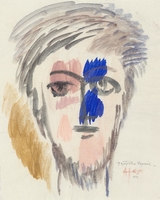 Αφαιρετική απόδοση ενός ανδρικού πορτραίτου, με έμφαση κυρίως στο τριχωτό της κεφαλής και στην περιοχή των ματιών. Το πρόσωπο ανέκφραστο, με σφιγμένα χείλη, κοιτά ευθεία μπροστά, ενώ δύο σημεία του προσώπου καλύπτονται με μπλε χρώμα.