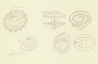 Μελέτη για Κοσμήματα, για σχέδια καρφίτσας, τα οποία φέρουν το καθένα τη δική του ονομασία. Ωοειδή σχήματα, σπείρες και γωνιώδεις απολήξεις δημιουργούν πρωτότυπα σχέδια για εκτέλεση κοσμημάτων.