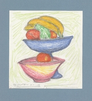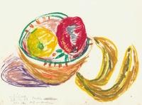 Μελέτη νεκρής φύσης με φρούτο. Η καλλιτέχνιδα δημιουργεί μια νεκρή φύση με φρούτο, το οποίο εντάσσει σε ένα απροσδιόριστο περιβάλλον, που χαρακτηρίζεται από έντονη χρωματική ποικιλία, σαν να επρόκειτο για μελέτες χρωμάτων.