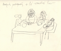 Η Άλεξ Μυλωνά δημιουργεί μια σειρά σχεδίων σε χαρτί, το οποίο στη συνέχεια διπλώνει και γίνεται σαν ένα μικρό τετράδιο. Στο σχέδιο αυτό απεικονίζεται μια συνάθροιση γύρω από το τραπέζι. Η απεικόνιση λιτή παρουσιάζει μόνο τα απαραίτητα στοιχεία χωρίς να μας δίνει περισσότερες πληροφορίες για τον χώρο και τα πρόσωπα.